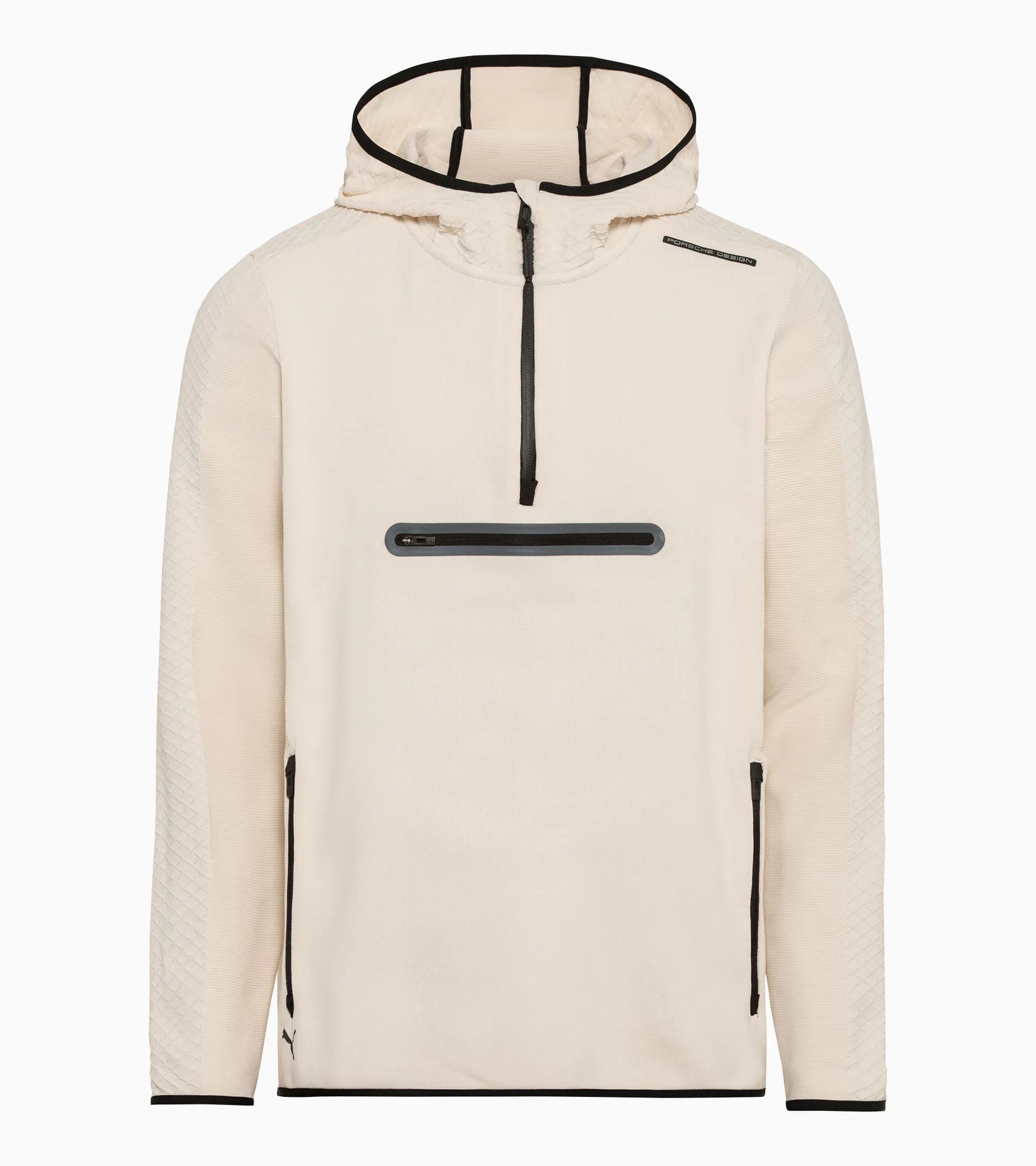 Die EvoKNIT® Midlayer-Jacke ist die Fusion von funktionaler Sportjacke und exklusivem Statement-Design. Dass hier Porsche-DNA in jeder Faser steckt, unterstreichen u. a. drei verschiedene Strickmuster, die 3-Panel-Kapuzenkonstruktion und die hochwertige Verarbeitung der Jacke. Die nahtlose Kängurutasche, die Brusttasche mit Reißverschluss, der Stehkragen in der Kapuze und die Bungee-Kordel mit Porsche Design-Branding setzen optische Akzente. Die elastische Einfassung an Kapuze, Ärmeln und Saum bietet ausgezeichneten Tragekomfort. Der mittige 1/4-Reißverschluss rundet das stilsichere Design ab.