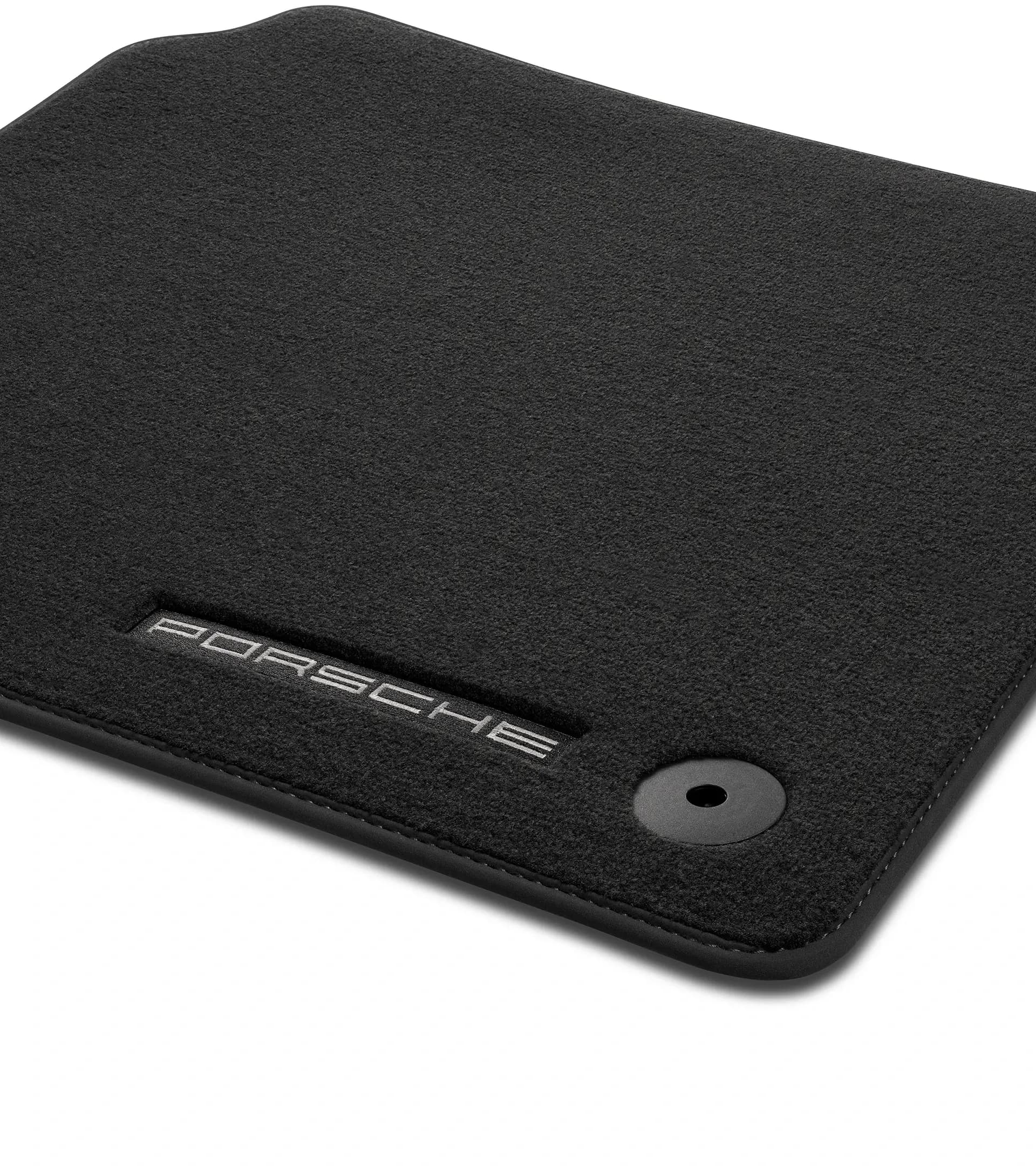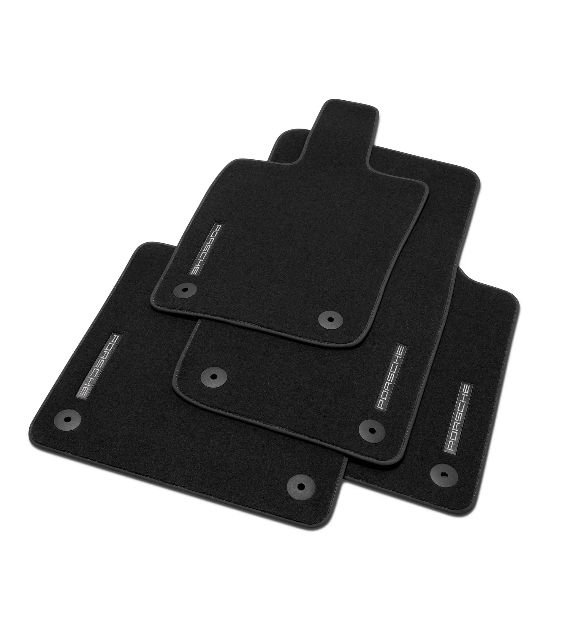 Vierteiliger Satz, in ausgewählten Interieurfarben, mit Nubukeinfassung und Einleger mit eingesticktem, silbernen „PORSCHE“ Schriftzug.