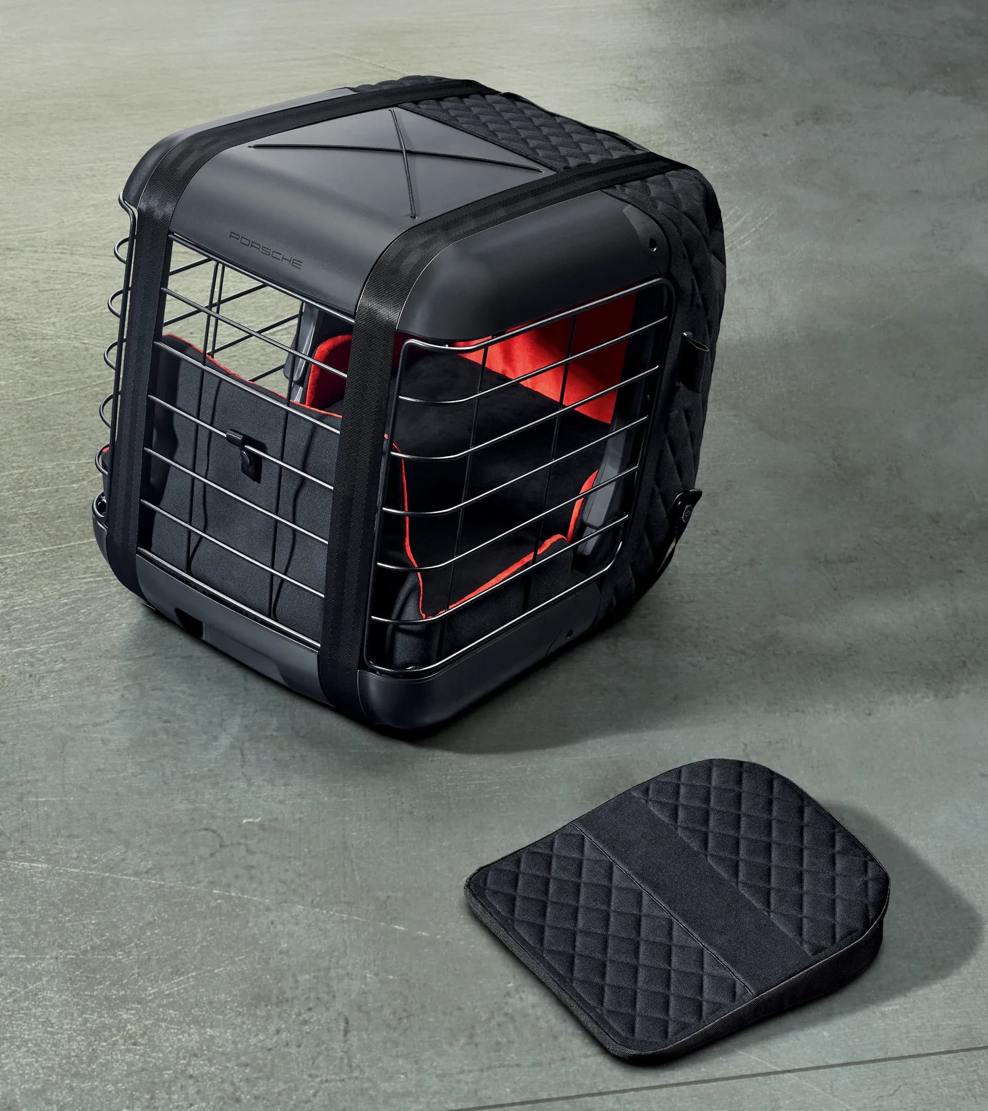 Die schwarze Hundetransportbox mit geprägtem „PORSCHE“ Schriftzug besteht aus hochwertigen und schadstofffreien Materialien. Der Boden sowie die Innenwände sind mit komfortablen schwarzen und roten Polstern ausgestattet. Diese sind abnehm- und waschbar. Bei Bedarf kann das beiliegende keilförmige Kissen unter die Box gelegt werden, um die Neigung der Fahrzeugsitze auszugleichen und den Tieren so eine ebene Liegefläche zu bieten.