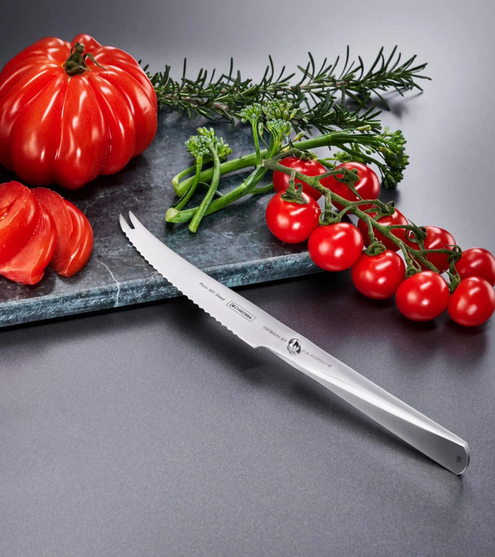 Dieses Porsche Design Obst- und Gemüsemesser ist mehr als nur ein Werkzeug – es ist ein Statement für exzellentes Design und professionelle Handwerkskunst in Ihrer Küche. Speziell entwickelt zum Spicken von Fleisch und Schälen sowie Schneiden von Obst und Gemüse, überzeugt das Messer durch seine exzellente Schnittqualität und herausragende Ergonomie.Heft und Klinge gehen nahtlos ineinander über und sorgen so für eine harmonische und fließende Handhabung. Einzig die markante Edelstahl-Perle signalisiert subtil den Übergang zwischen Klinge und Griff und dient gleichzeitig als ideale Auflage für Daumen und Zeigefinger. Das ergonomisch gestaltete Heft orientiert sich bewusst an den Arbeitsweisen professioneller Köche, die ihre Messer in variablen Schneidewinkeln nutzen. Dank der speziellen Phasen am Heft wird eine komfortable und flexible Handhabung ermöglicht, ohne dabei eine feste Halteposition vorzugeben.Gefertigt aus hochwertigem japanischem Pure 301 Stahl, garantiert die Klinge Langlebigkeit und außergewöhnliche Schärfe, die selbst höchsten Ansprüchen gerecht wird. Design by Studio F. A. Porsche.