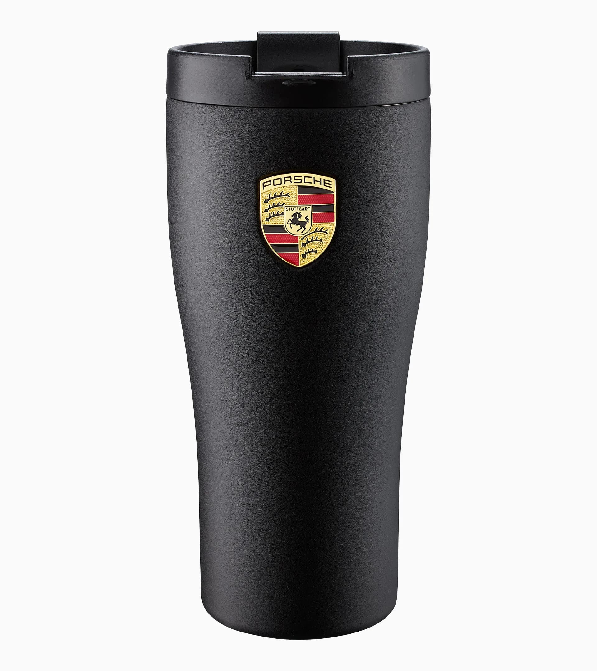 Hochwertiger Porsche Thermobecher mit robuster Pulverbeschichtung. Fassungsvermögen ca. 460 ml.