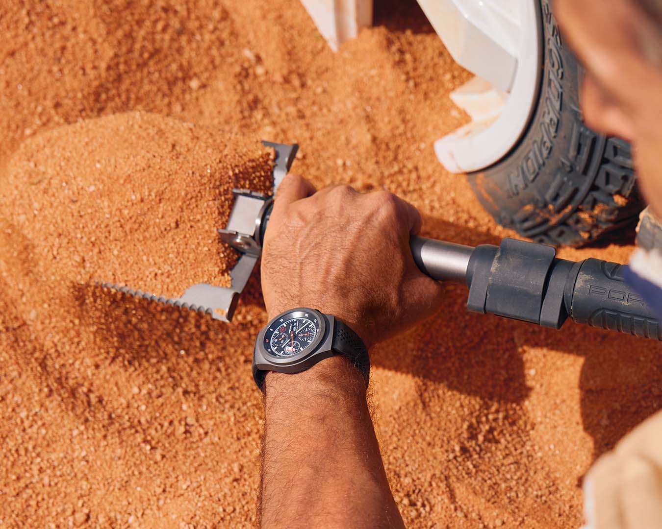 Der Chronograph 911 Dakar bietet eine optimale Ablesbarkeit – auch wenn die Sonne am wolkenlosen Himmel wie ein überdimensionaler Feuerball brennt und das Dach des Porsche 911 Dakar den einzigen Schatten spendet. Die in Rot ausgeführte 60 der Minuterieskala auf der Rehaut hilft als 12-Uhr-Markierung bei der Orientierung und zieht die Blicke genauso schnell auf sich wie die roten Stoppzeiger. Zusätzlich sind die Striche der kleinen Stundenanzeige für ganze Stunden dicker gezeichnet als die Halbstundenstriche. Ebenfalls auf dem schwarzen Zifferblatt in diesem Rot gehalten: der Schriftzug für das Porsche Design WERK 01.240 mit Flyback-Funktion.