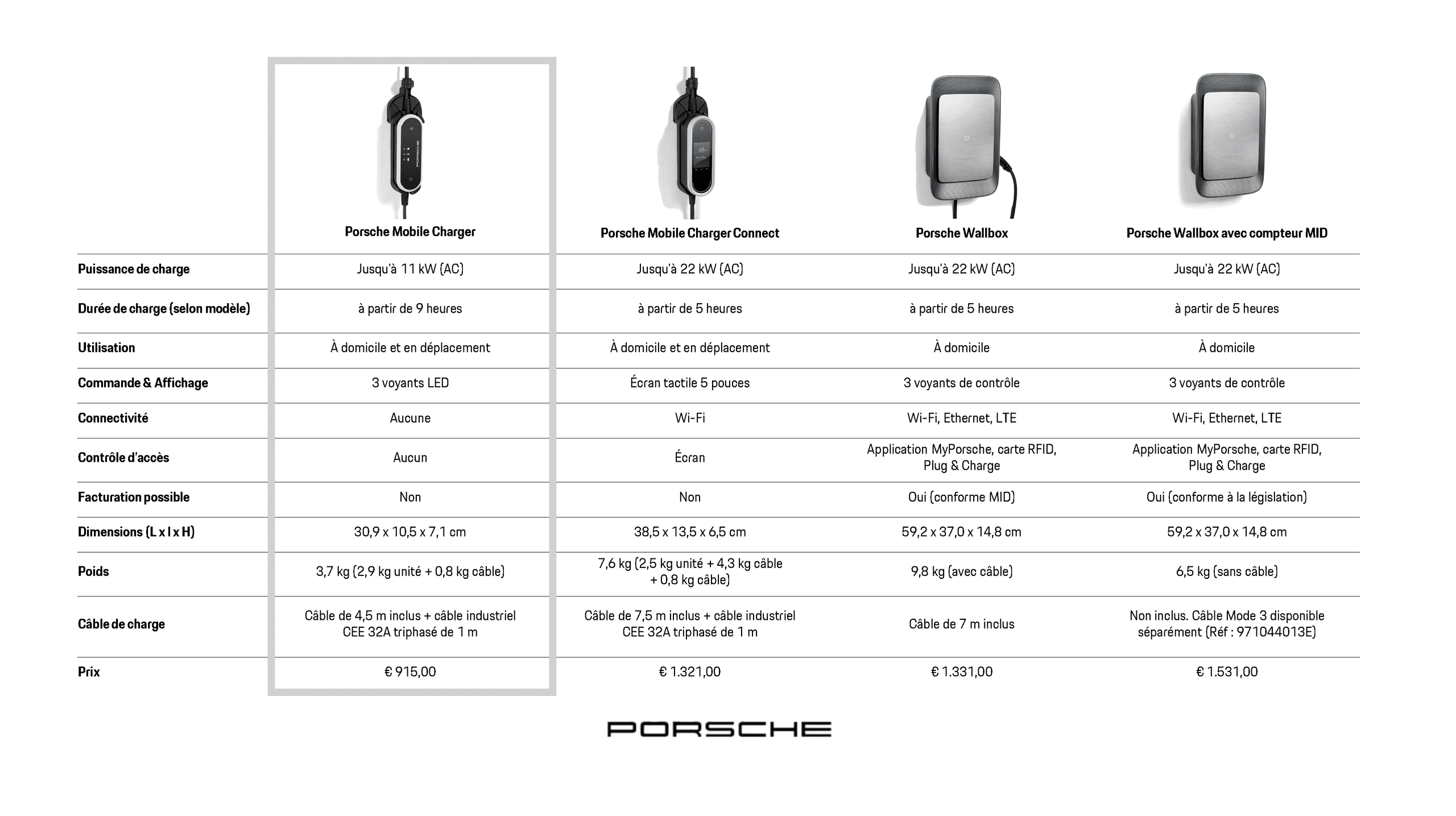 1Remarque : Les équipements de recharge Porsche conviennent exclusivement aux véhicules qui répondent aux normes et directives généralement applicables pour les véhicules électriques. La compatibilité n'est garantie que pour les véhicules électriques dotés d'une prise de type 2. Le temps de charge dépend du modèle de véhicule, de l'équipement du véhicule et du pays dans lequel il est rechargé.