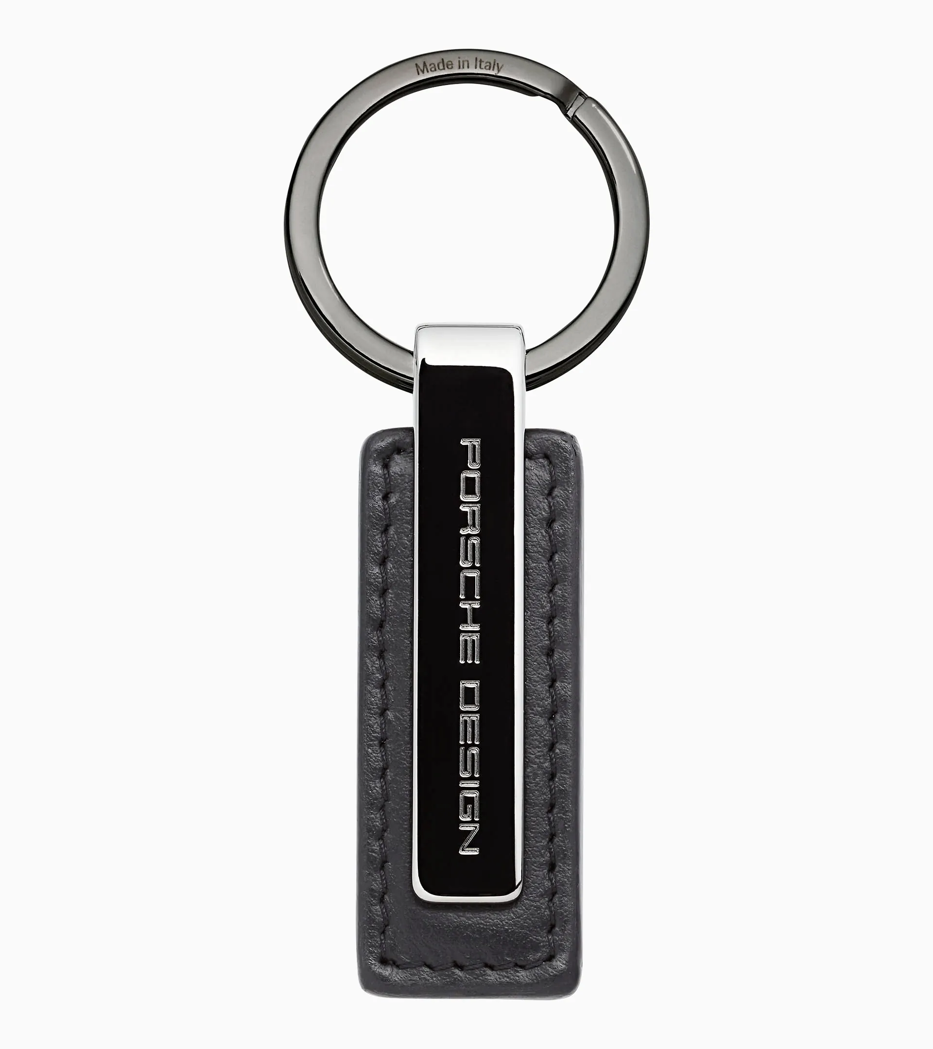 Porte-clés design de haute qualité pour homme. Le porte-clés avec anneau fendu est en cuir et comprend une étiquette en métal avec gravure Porsche Design.