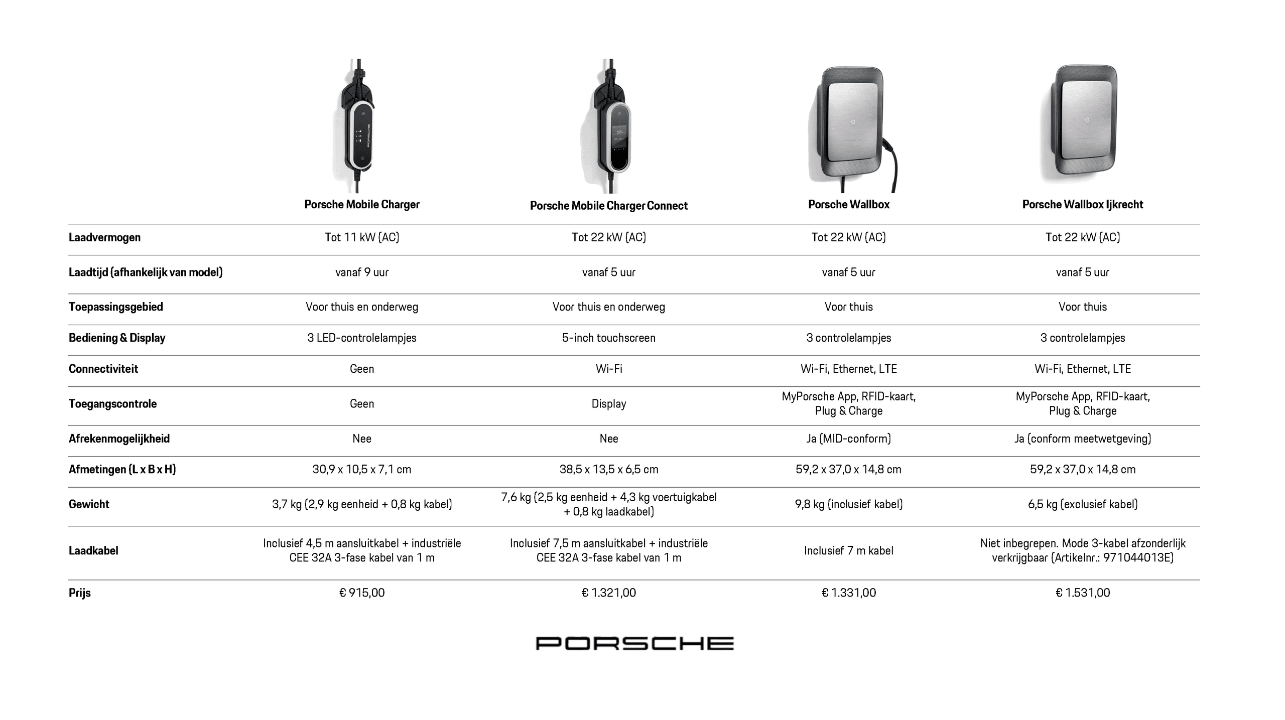 Porsche biedt verschillende laadapparatuur aan, zoals de Porsche Wallbox, de Porsche Mobile Charger en de Porsche Mobile Charger Connect. Tevens zijn er verschillende montagemogelijkheden beschikbaar, zoals de oplaaddock of de compacte laadpaal van Porsche.