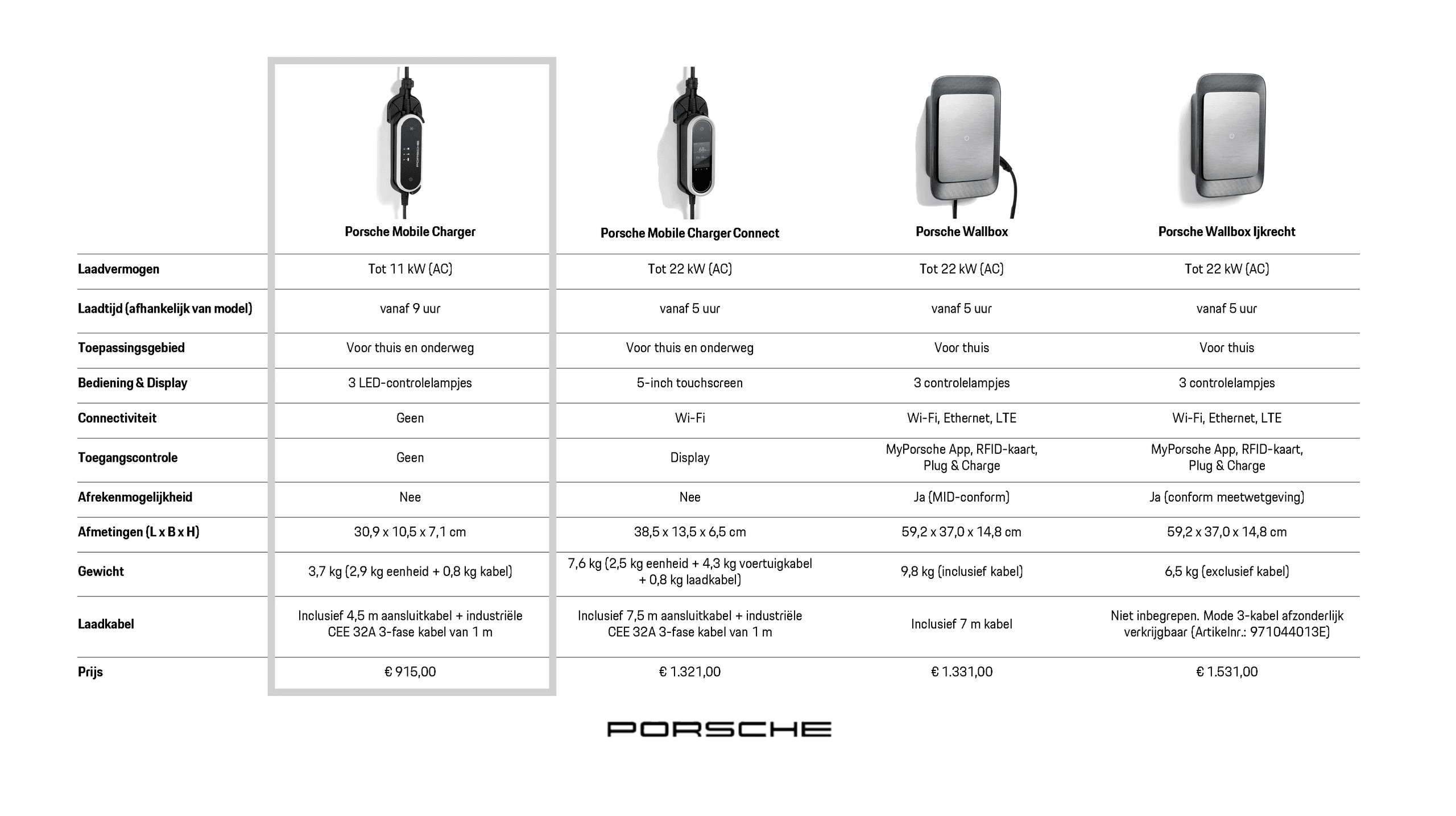1Let op: De Porsche laadapparatuur is alleen geschikt voor gebruik bij voertuigen die voldoen aan de algemeen geldende normen en richtlijnen voor elektrische voertuigen. Compatibiliteit is alleen gegarandeerd voor elektrische voertuigen met een type 2-stekker. De oplaadtijd is afhankelijk van het voertuigmodel, de uitrusting van het voertuig en het land waarin wordt opgeladen.