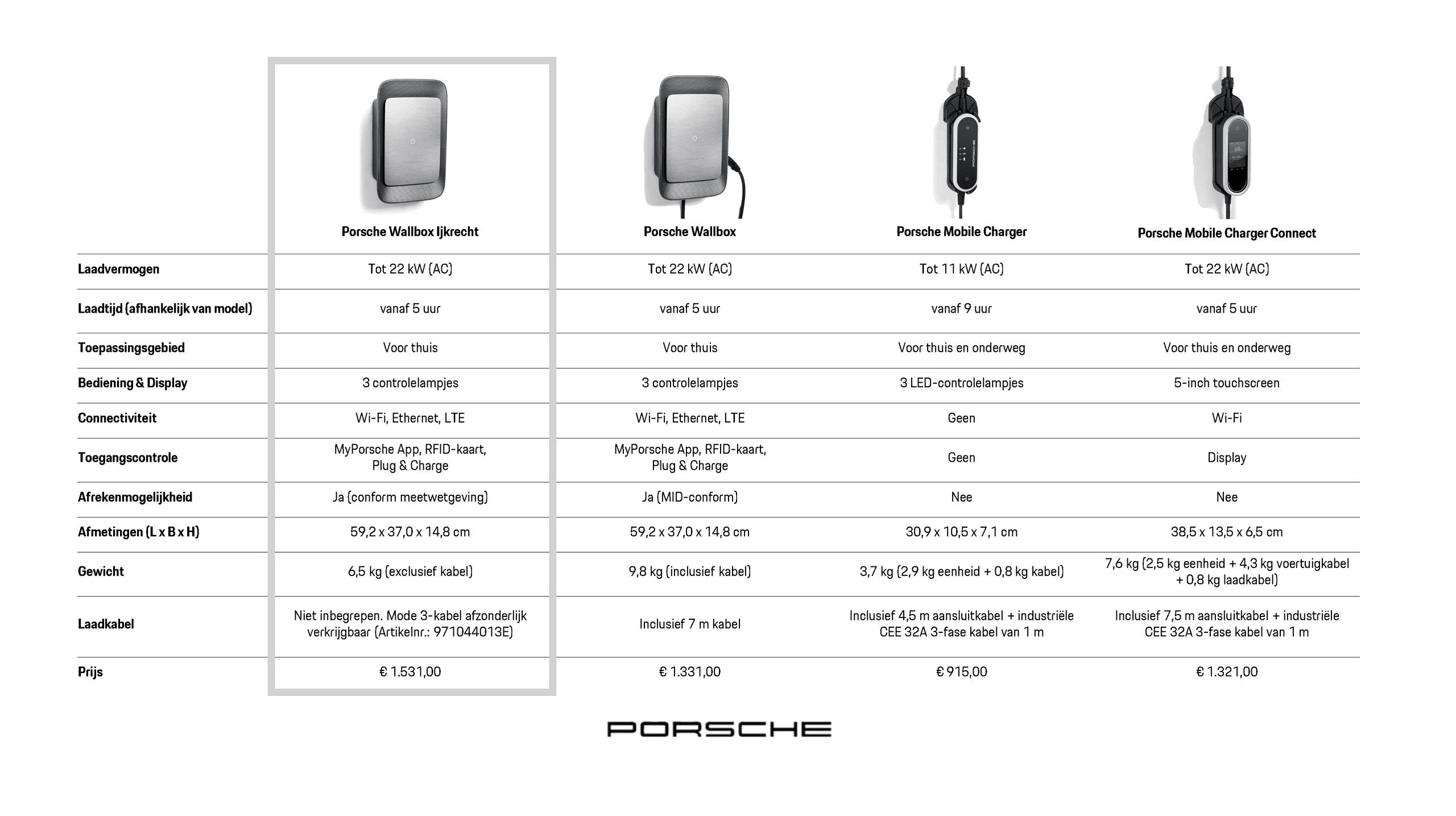 1Let op: De Porsche laadapparatuur is alleen geschikt voor gebruik bij voertuigen die voldoen aan de algemeen geldende normen en richtlijnen voor elektrische voertuigen. Compatibiliteit is alleen gegarandeerd voor elektrische voertuigen met een type 2-stekker. De oplaadtijd is afhankelijk van het voertuigmodel, de uitrusting van het voertuig en het land waarin wordt opgeladen.