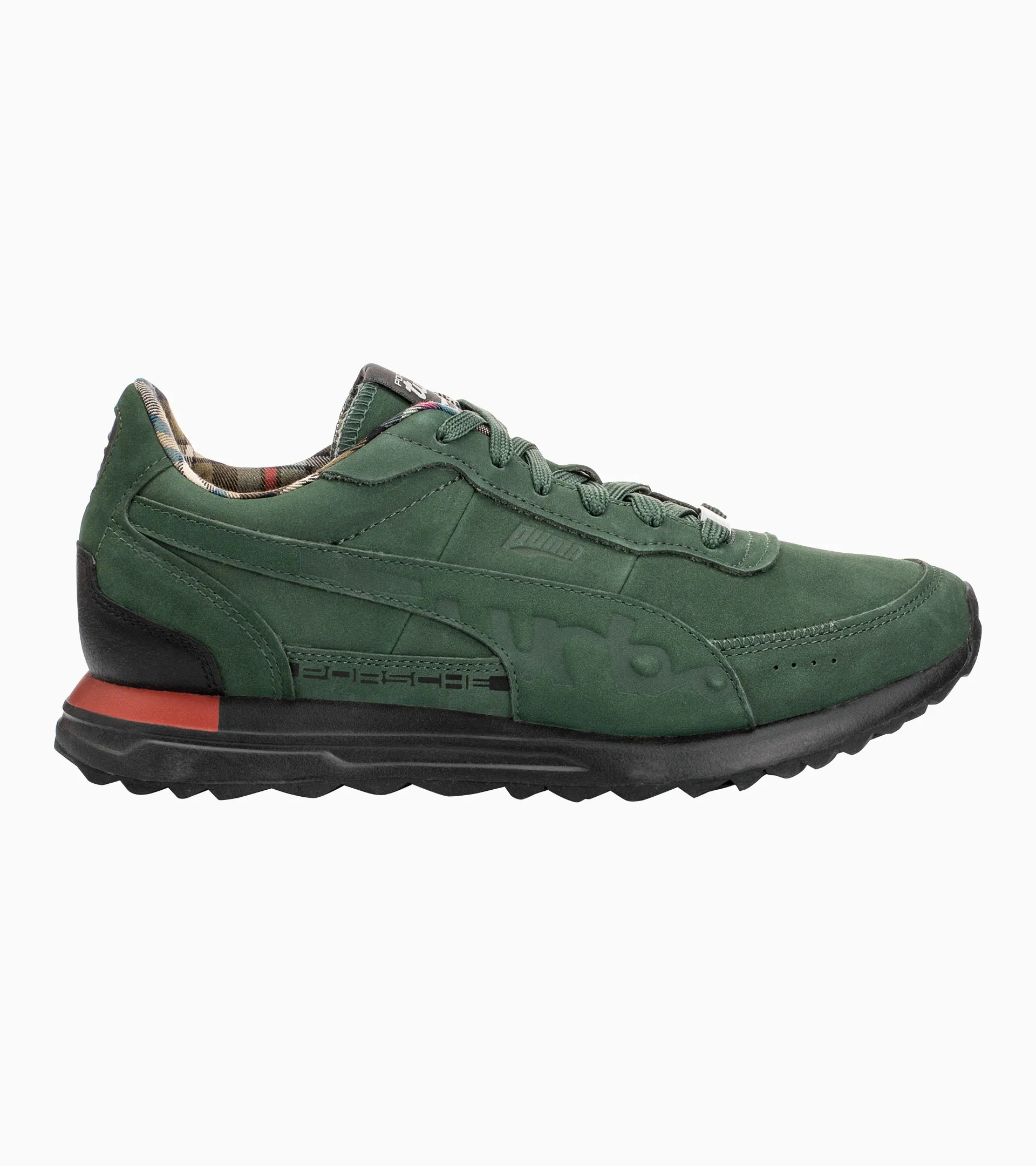 Perfect for anyone who wants to wear a piece of Porsche history on their feet: the 50Y 911 Turbo Sneakers 'Turbo 930' celebrate the 50th anniversary of the Porsche 911 Turbo with an iconic inner lining – inspired by the legendary 'Mackenzie' tartan pattern of the seats of a first-generation Turbo. The nubuck leather is based on the Green Metallic exterior colour and exudes sporty elegance, while the Porsche lettering, which was available as a decal for the sports car, makes the shoe a real eye-catcher. A special highlight: the Turbo lettering on the Formstrip. The embossing gives the sneakers that certain something. On the heel, the Red element is reminiscent of the sports car's continuous brake light. A removable badge with the 50Y Anniversary print and additional laces underline the luxurious character of the shoe. The Porsche Crest on the heel adds a refined detail reminiscent of the legendary Fuchs wheel that was available to order for the first Turbo generation. The insole features the striking silhouette of the first Porsche 911 Turbo – a tribute to the beginnings of this legend. The design is rounded off by a shoe bag, inspired by the look of a shoe box, with a zip and a two-tone, adjustable carrying strap. Limited to 911 units.