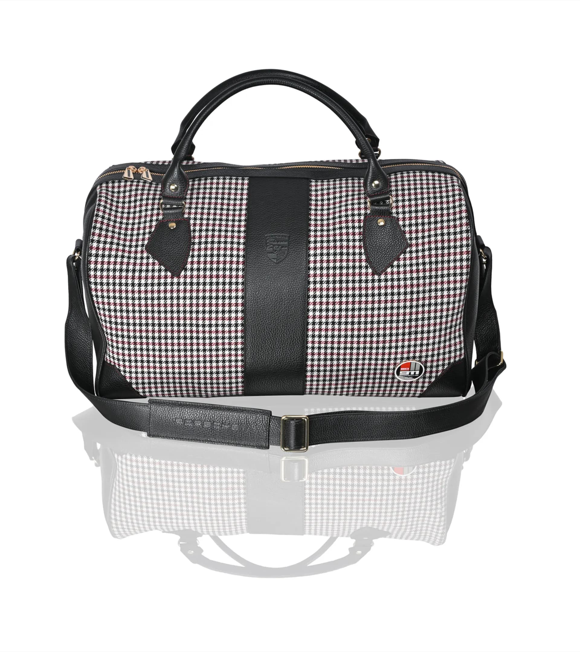 Porsche Classic '60 Years of 911' touring bag in houndstooth pattern with 60 Years badge.