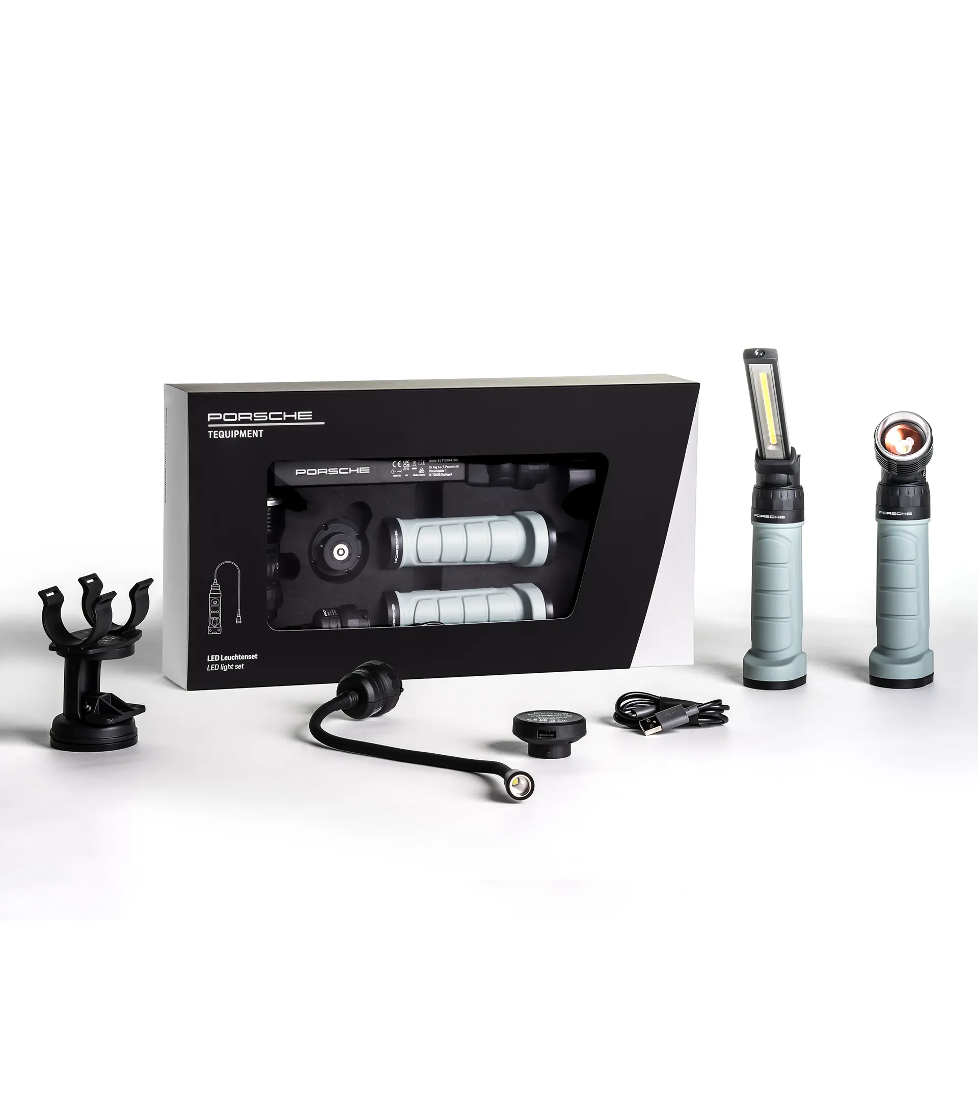 The LED light set from Porsche Tequipment is a real all-rounder: thanks to various module attachments, you always have the ideal lighting at hand – whether it be an inspection light for the workshop or a torch for your next camping trip. The handle modules with integrated batteries can be mounted in a variety of ways using hooks, magnets or suction cups. And with the included adapter, they can also be used as power banks.