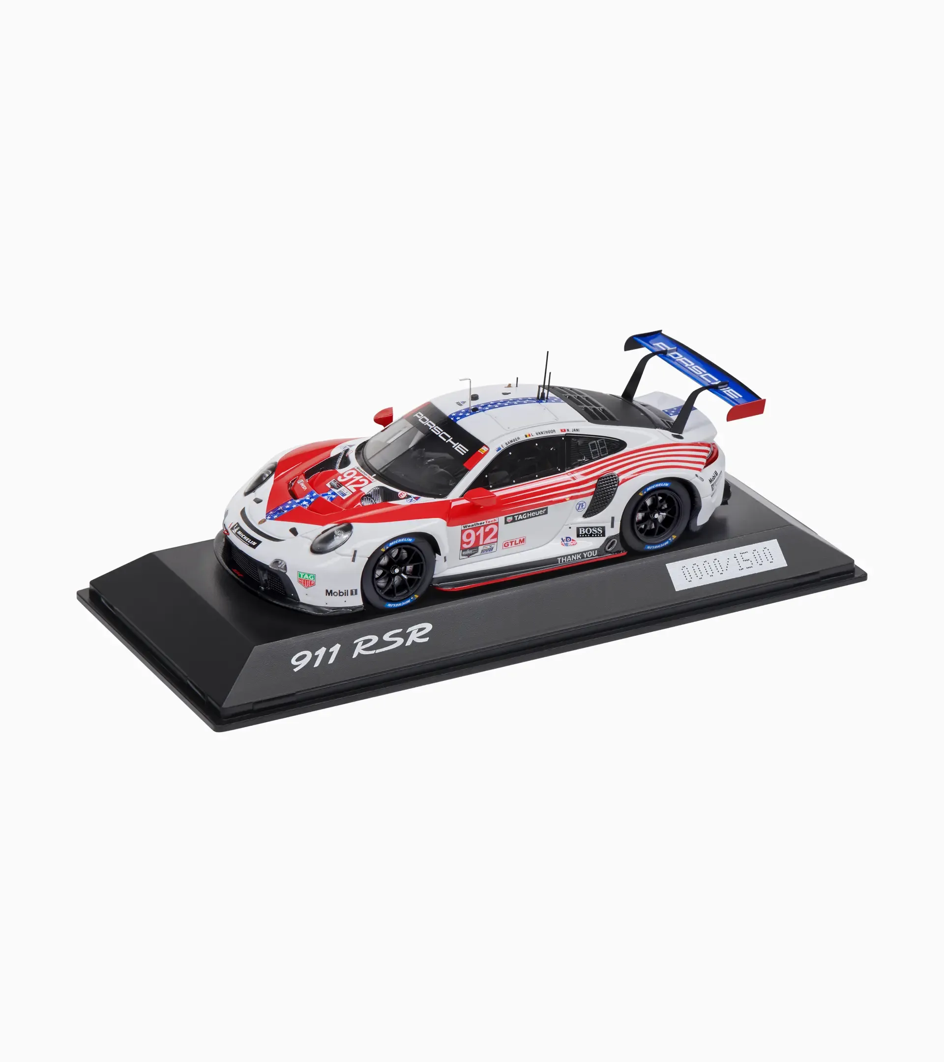 From the race track straight to your home: The high-quality, detailed collector's model of the Porsche 911 RSR #912 IMSA Farewell, 12h Sebring 2020 is a real eye-catcher on the shelf or desk.