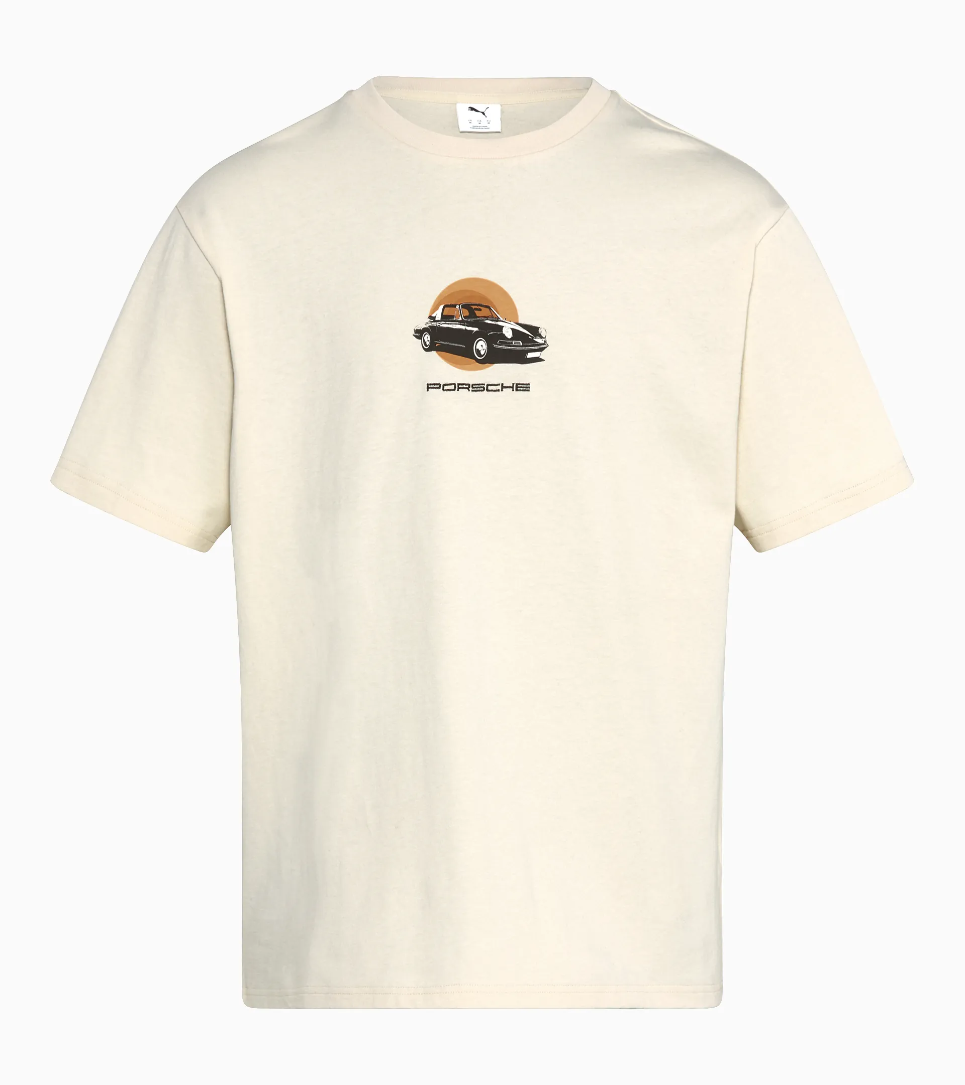 Timeless, iconic, with an eye for detail – the 911 Targa 60Y Capsule collection combines retro charm with timeless design as a tribute to the 60th anniversary of the sports car. Capsule incorporates historical elements of the first Porsche 911 Targa generation and reinterprets them in selected key pieces.This T-shirt made of high-quality, heavy-weight cotton is a must-have for true Porsche 911 Targa fans. On the back, there is a large illustration of the first Porsche 911 Targa generation, inspired by a historic Porsche advertising poster from 1967. The theme is combined with the embroidered original Porsche 911 Targa model lettering. At the front, a small graphic print and the embroidered Porsche Wordmark add subtle design accents. A statement piece that is extremely comfortable to wear.