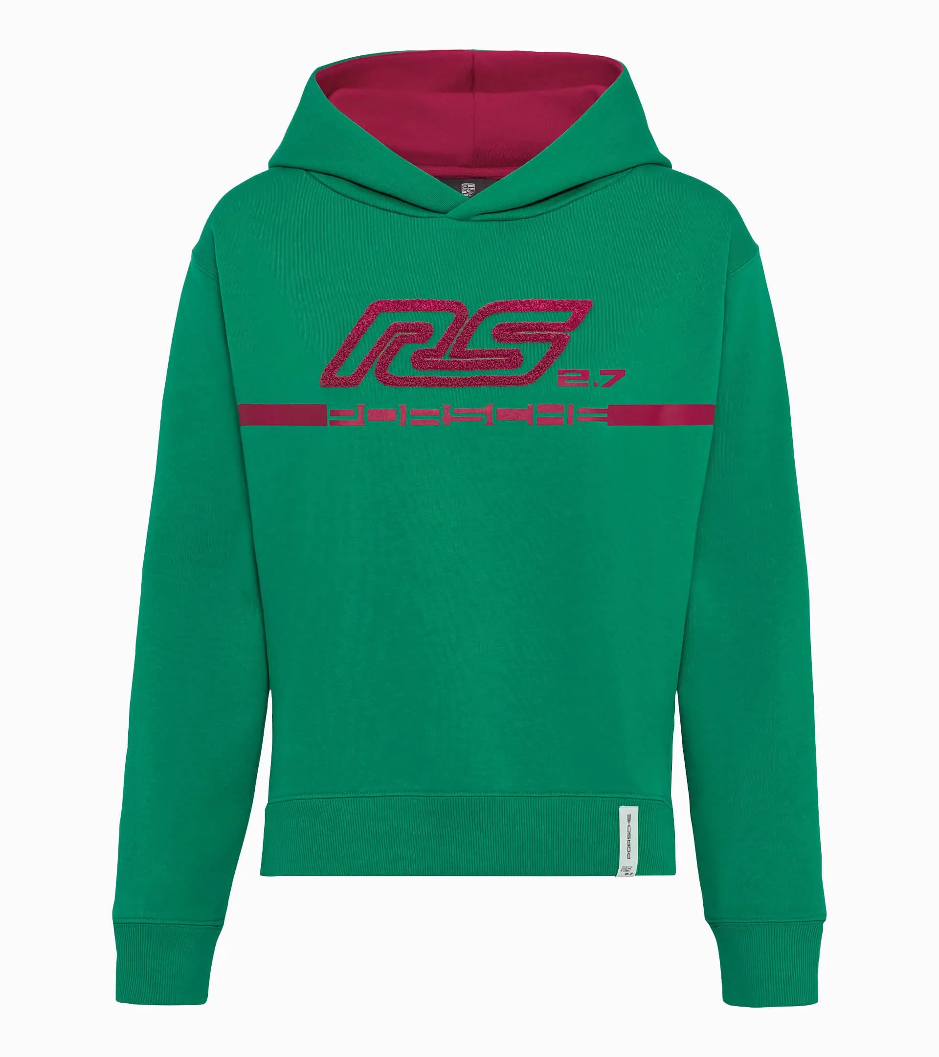 Casual and comfortable: Women's hoodie with RS 2.7 terrycloth embroidery and Porsche print. The colours are inspired by the 911 Carrera RS 2.7, which was introduced in 1972 at the Paris Motor Show.