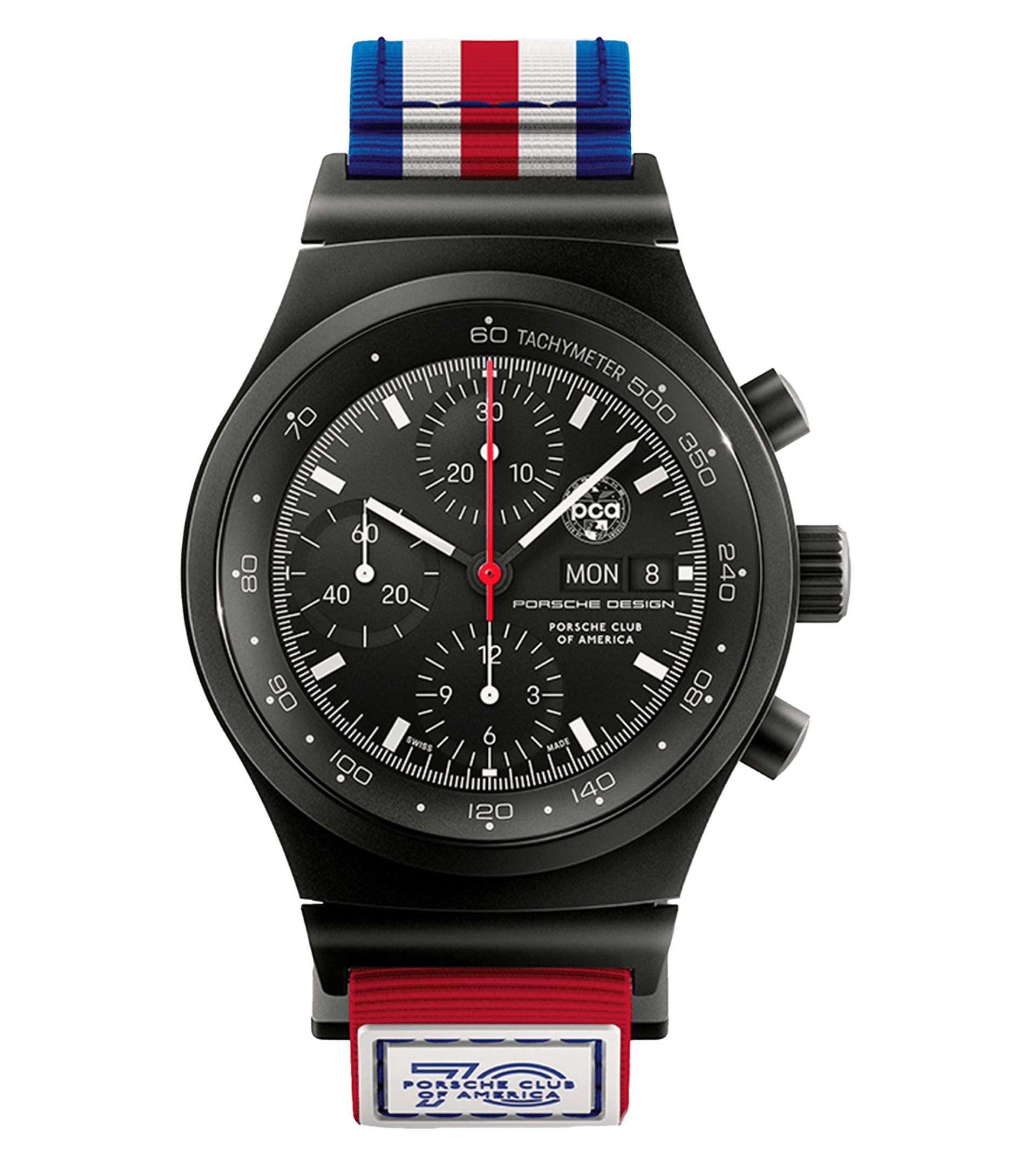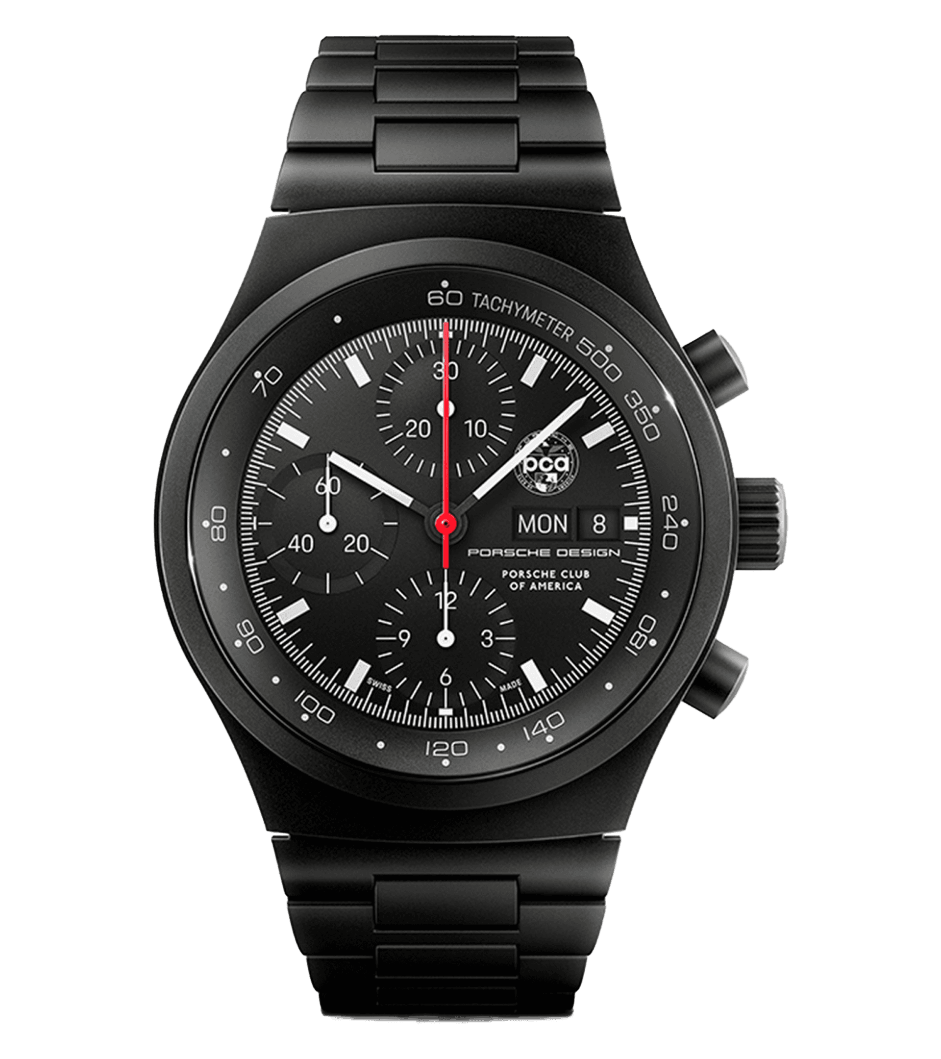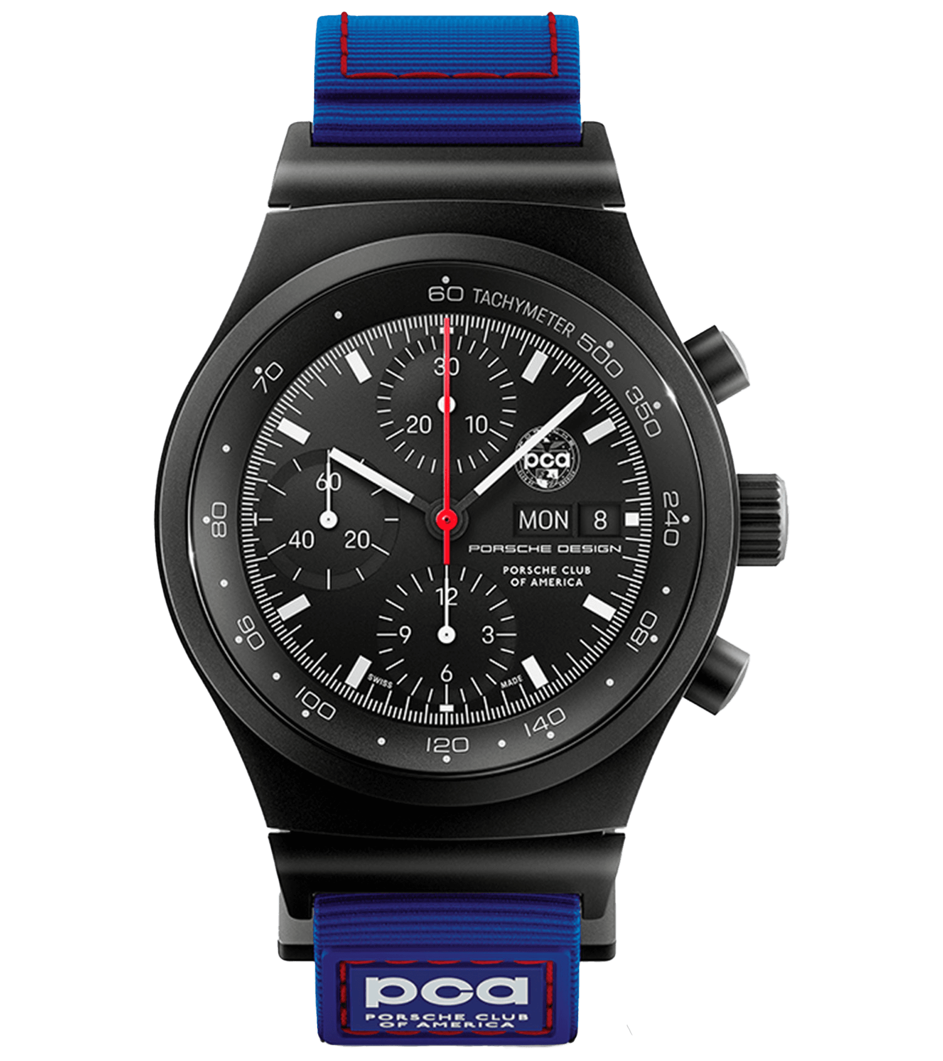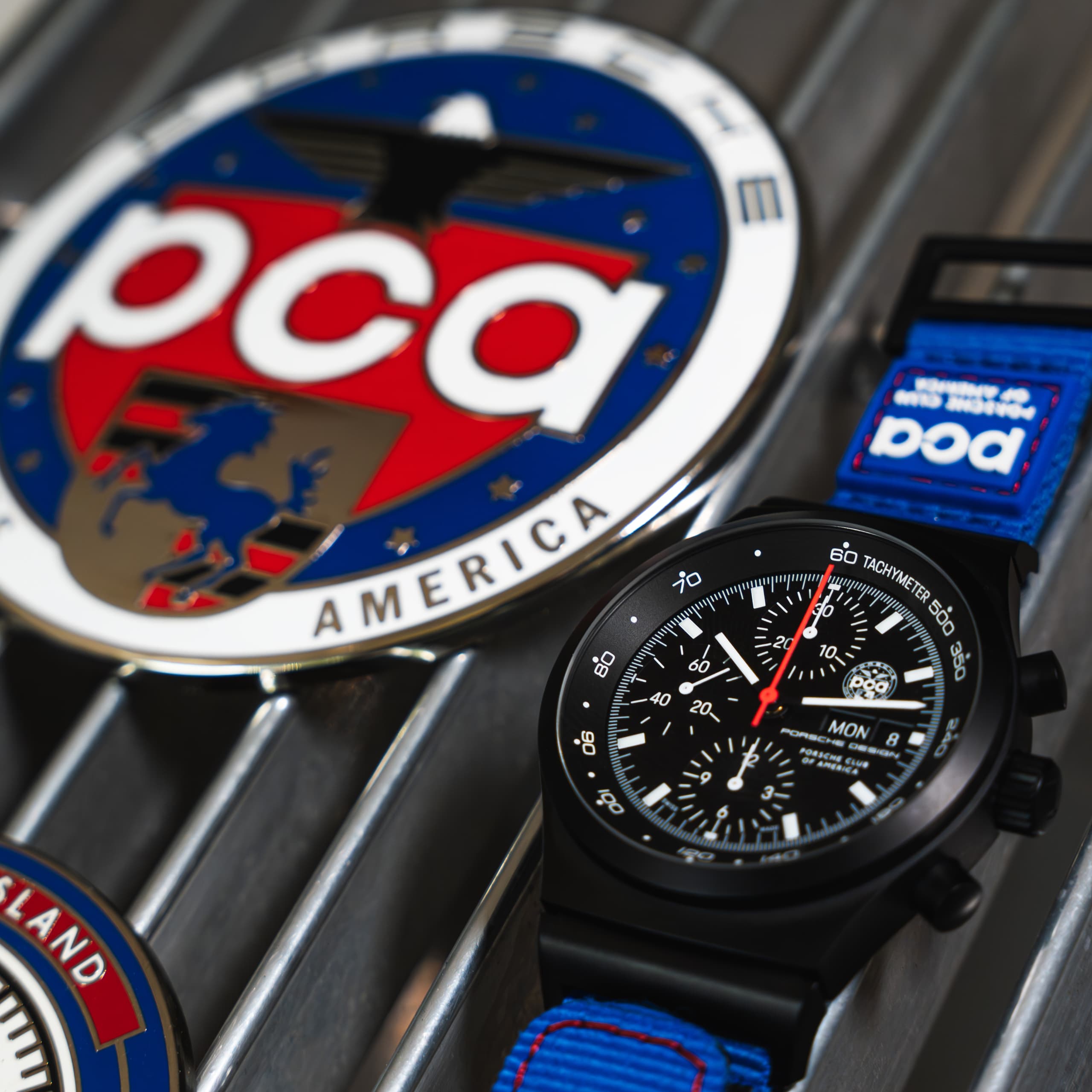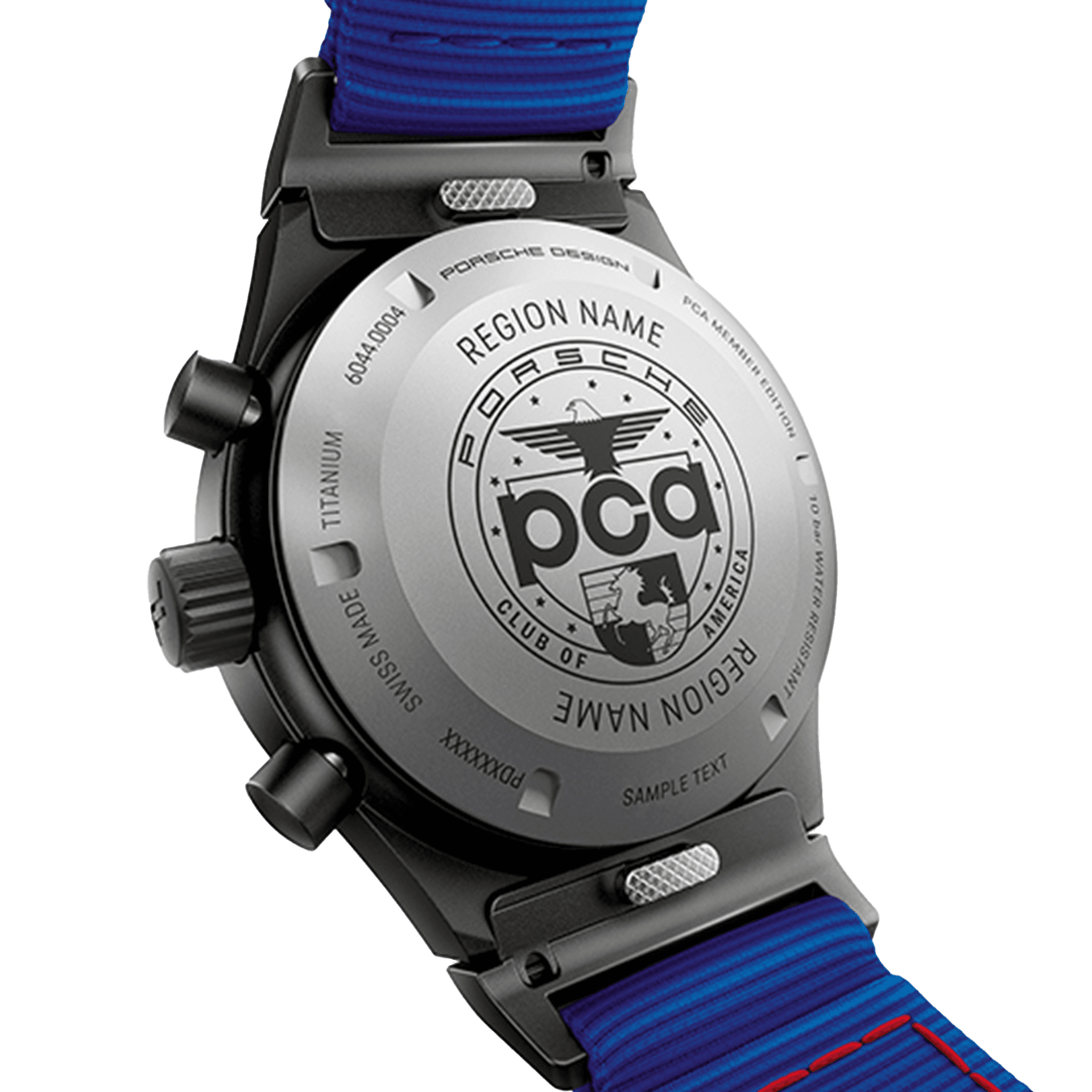 The Chronograph PCA - Member Edition comes in an exclusive Porsche Design timepiece box, featuring a unique engraved plaque engraved with "EXCLUSIVELY MANUFACTURED" or "PCA Region Name".