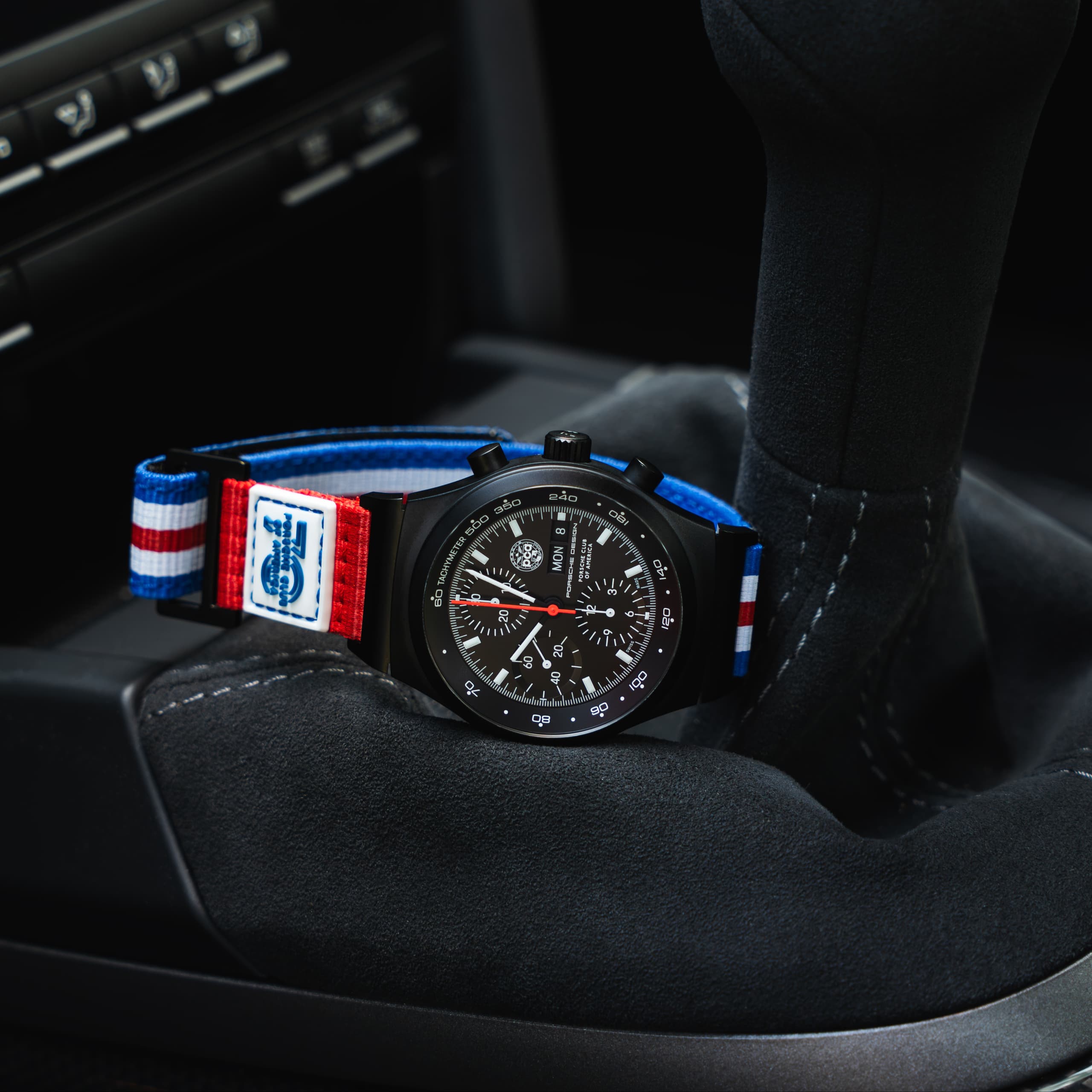 in addition to the regular titanium bracelet, the watch comes with a textile strap in Club Blau featuring the PCA logo. And those, who purchase this extraordinary timepiece by September 30, 2025, will receive a special anniversary gift: the "70-Year Anniversary" strap designed in PCA's red, white and blue colors, and featuring the "70 Years Porsche Club of America" anniversary logo.