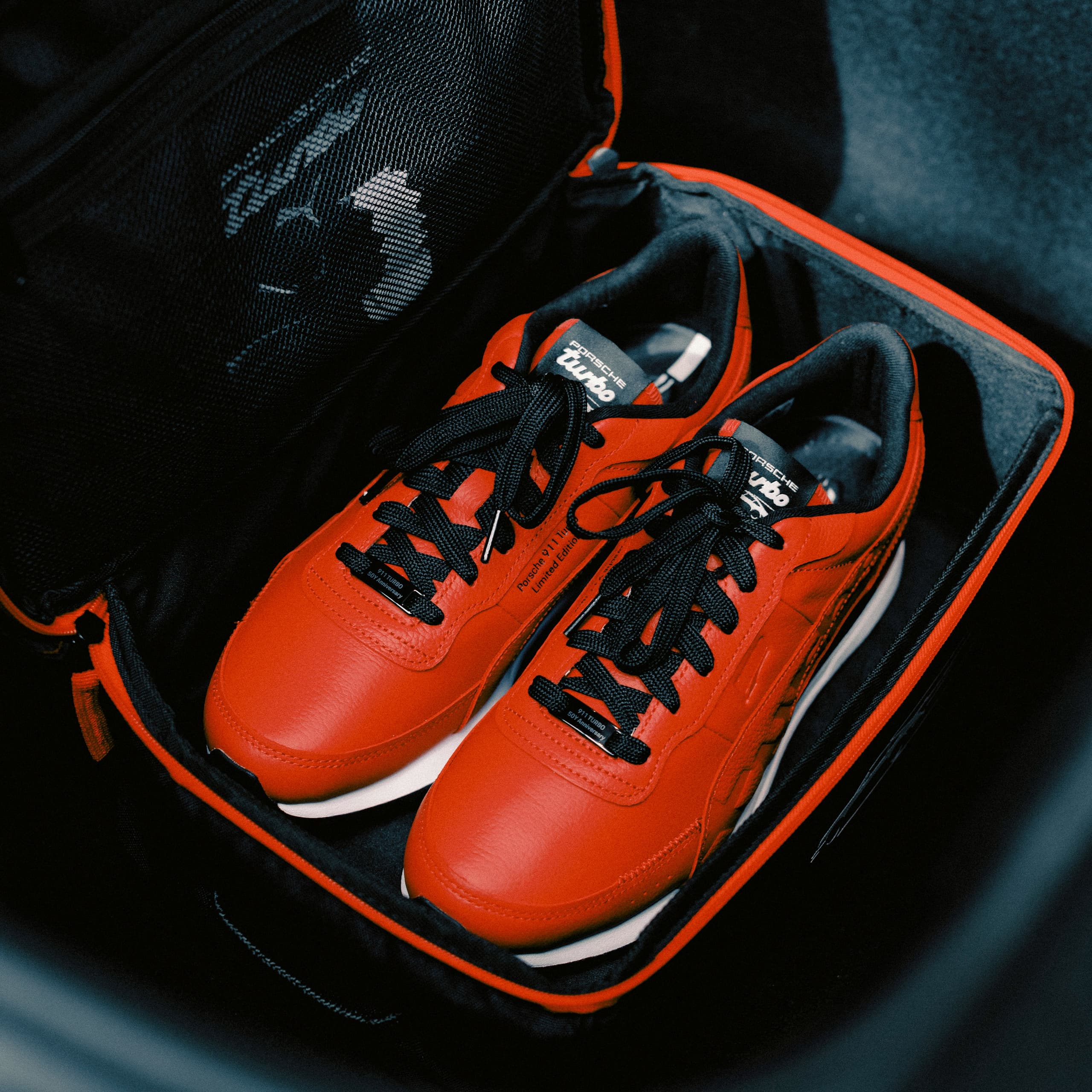 Sneaker Porsche exclusive pour célébrer le 50e anniversaire de la 911 Turbo. Avec de nombreux détails de design et un sac à chaussures très stylé.