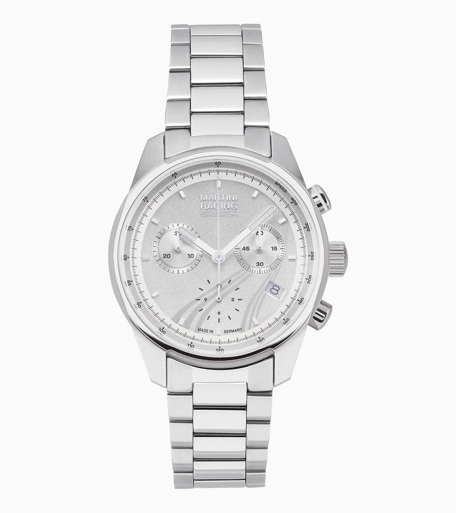 Ce Chronographe de la collection MARTINI RACING® a été conçu par le Studio F. A. Porsche. Ses caractéristiques contemporaines remportent la mise : du mouvement à quartz analogique RONDA au boîtier argenté en acier inoxydable finement brossé, en passant par le verre minéral au revêtement antireflet appliqué sur une face. Le Chronographe possède un guichet date (à 4 h) et trois totalisateurs avec les fonctions compteur des secondes (à 3 h), compteur chrono 30 minutes (à 9 h), compteur chrono des heures (à 6 h). Parmi les points forts esthétiques, citons le bracelet en acier inoxydable argenté, avec ses maillons brossés et polis, le cadran en métal poli assorti au design MARTINI RACING®, les index polis appliqués ainsi que l’inscription « MADE IN GERMANY » (à 6 h). La couronne, polie et vissée, est ornée d’un blason Porsche gravé. L’inscription « PORSCHE » sur le fermoir papillon du bracelet en acier inoxydable est également minutieusement gravée. En résumé, des détails raffinés et l’alliance parfaite de la forme et de la fonction font de ce Chronographe MARTINI RACING® Safari un véritable incontournable pour tous les fans de course automobile.