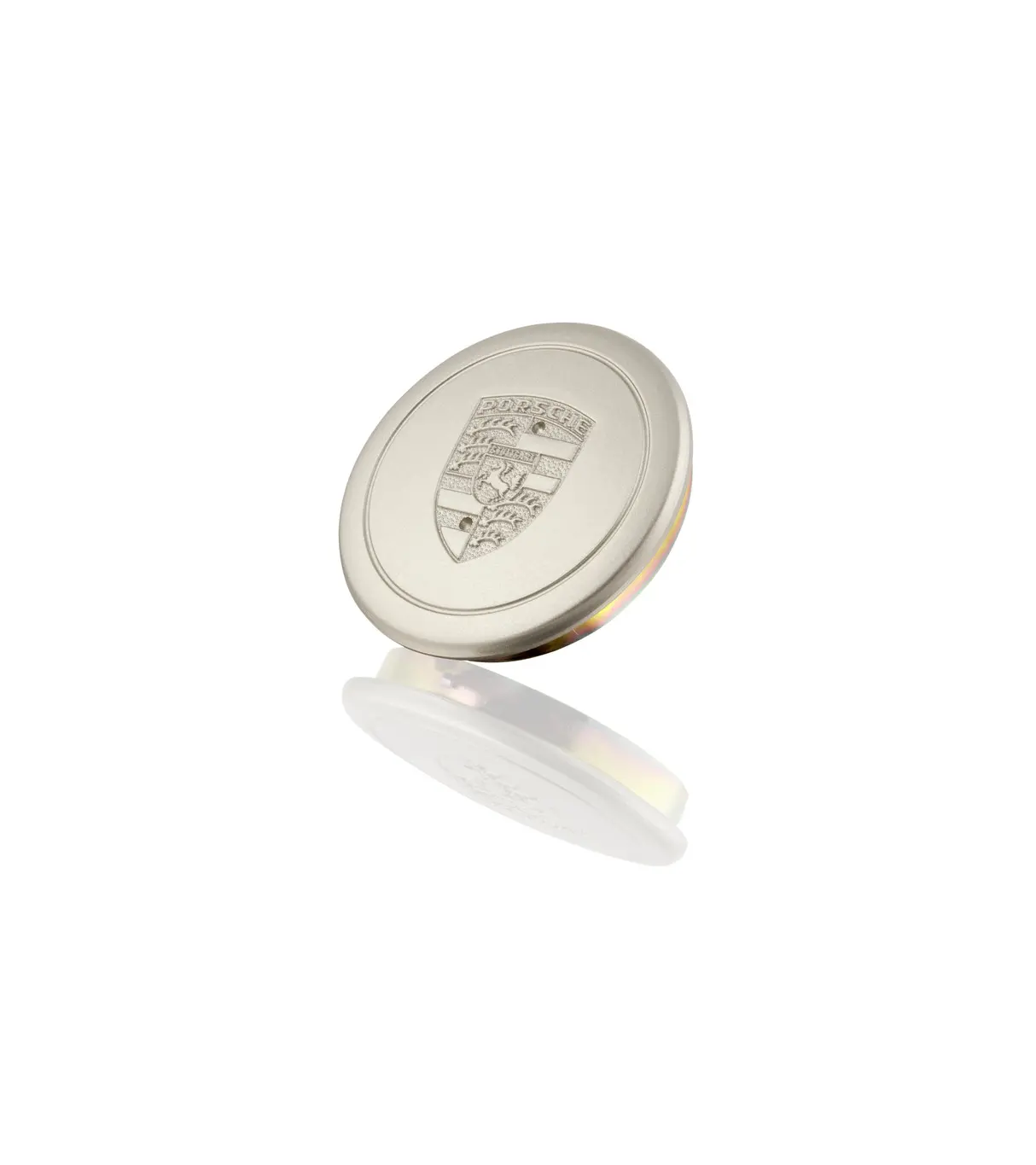 Enjoliveur de roue pour jante de diamètre intérieur 71 mm en or blanc métallisé avec écusson Porsche.