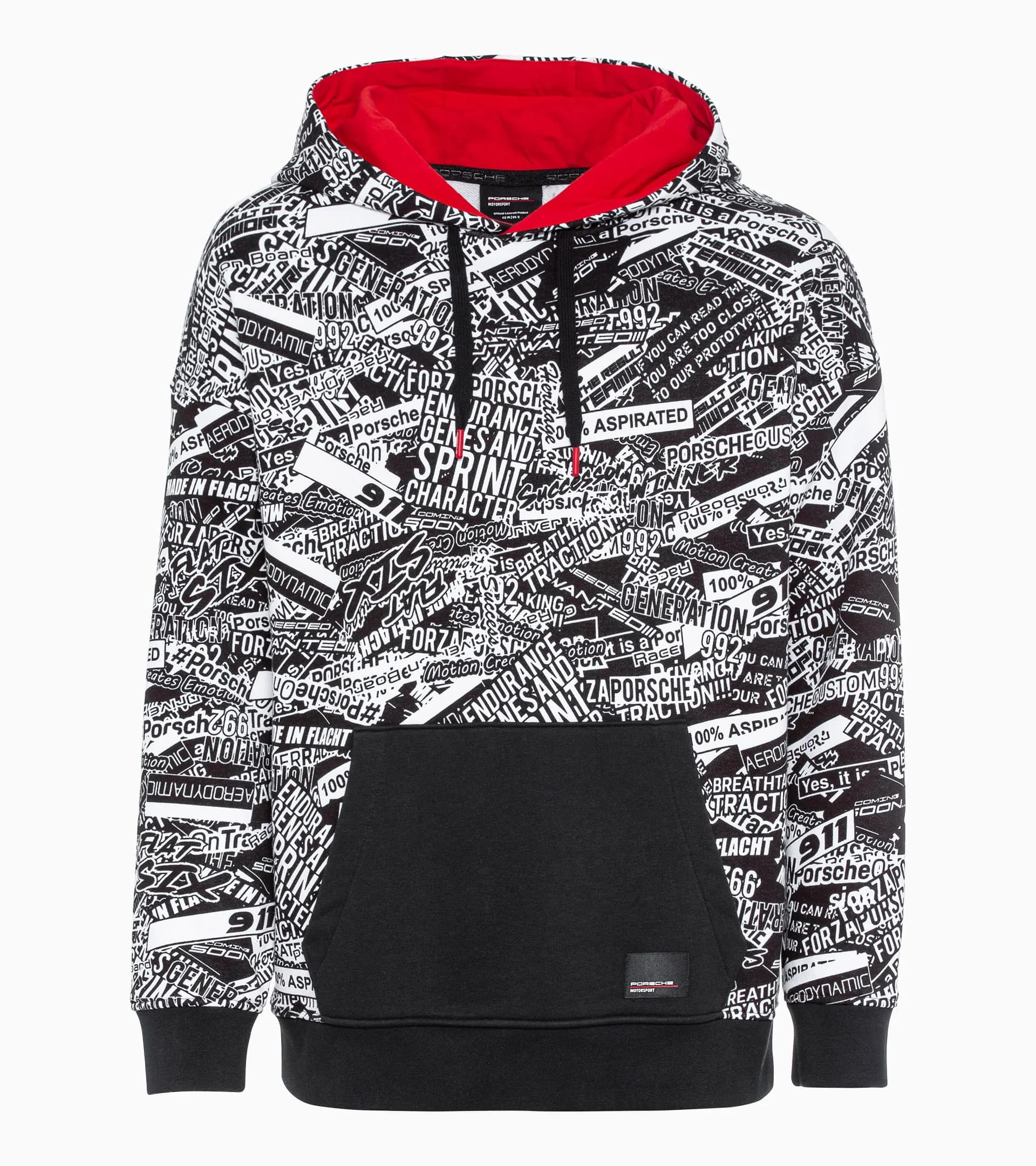 L’esprit de la compétition automobile, un design élégant et une qualité premium réunis dans la même collection – avec Motorsport Fanwear. Ce sweat-shirt unisexe se démarque habilement – avec son imprimé intégral inspiré du film de camouflage de la 911 GT3 R (992). L’étiquette Porsche Motorsport cousue sur le bord de la poche kangourou est un détail de design très particulier et souligne le look sportif du sweat à capuche. L’intérieur de la capuche et les cordons de serrage en Rouge viennent ajouter quelques touches raffinées.