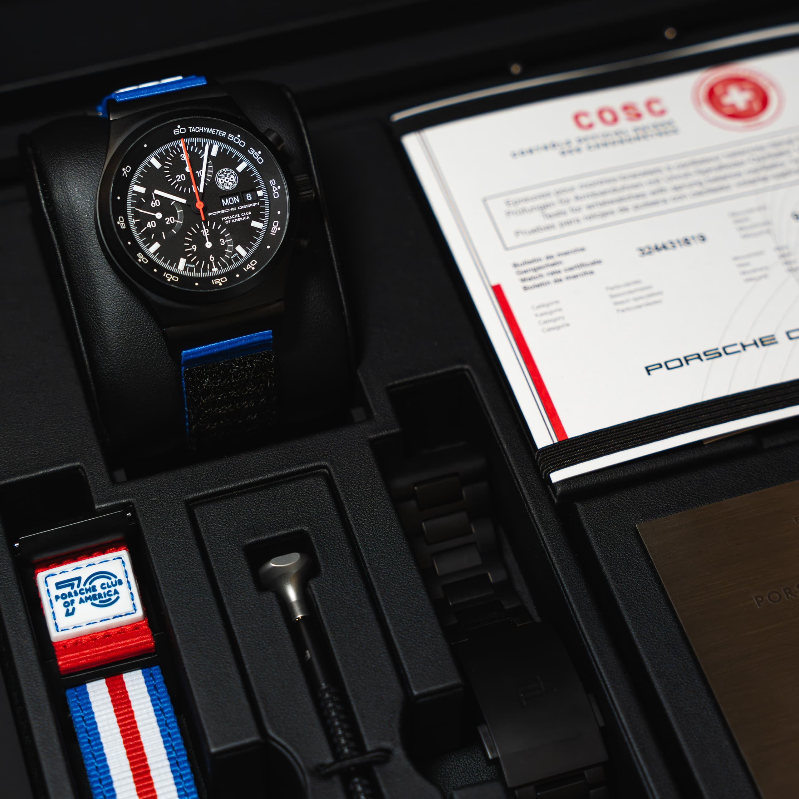 Le Chronographe – Édition Membre PCA est livré dans un écrin exclusif Porsche Design, avec une plaque gravée unique portant la mention « EXCLUSIVELY MANUFACTURED » ou le nom de la région PCA.