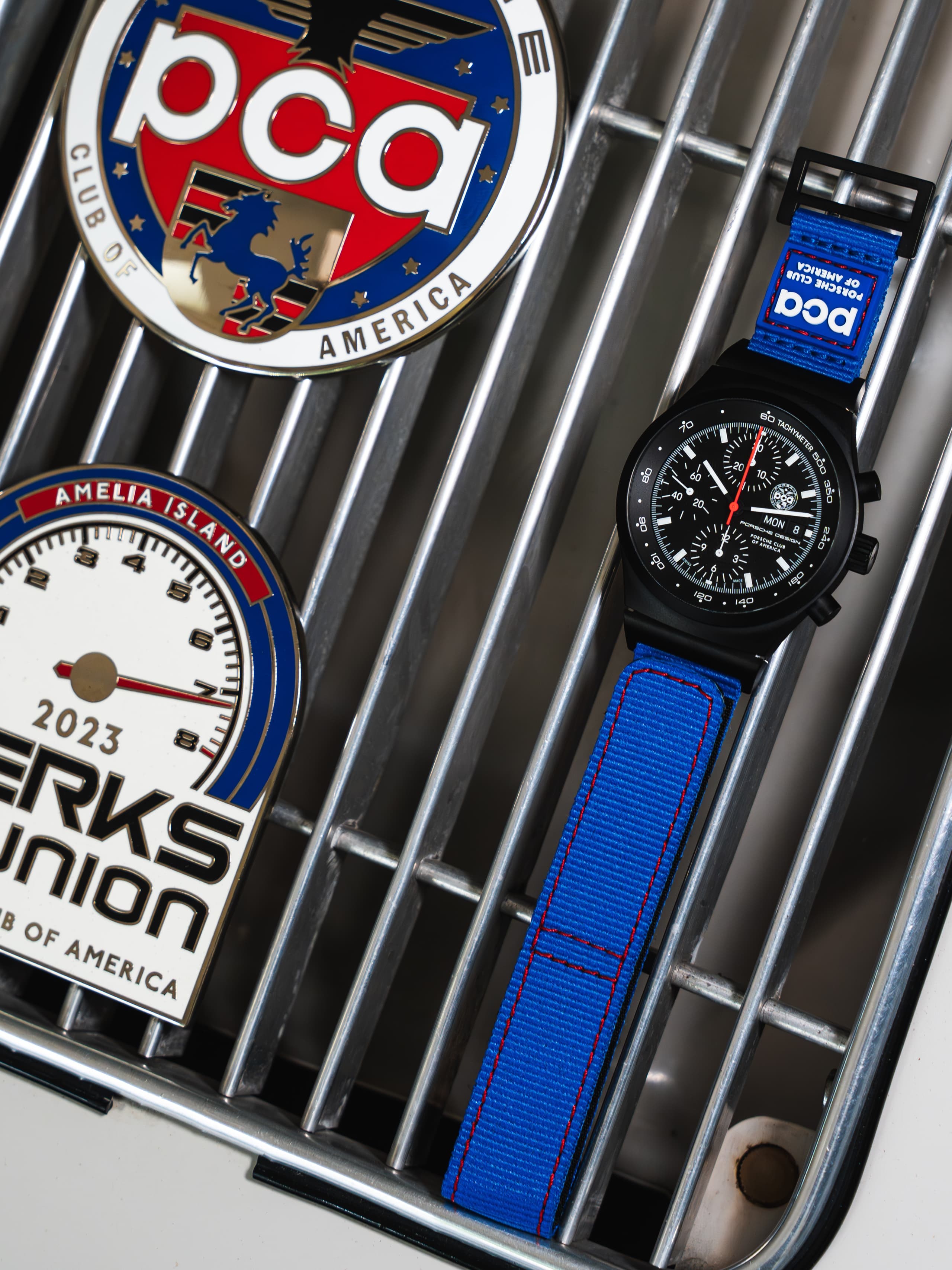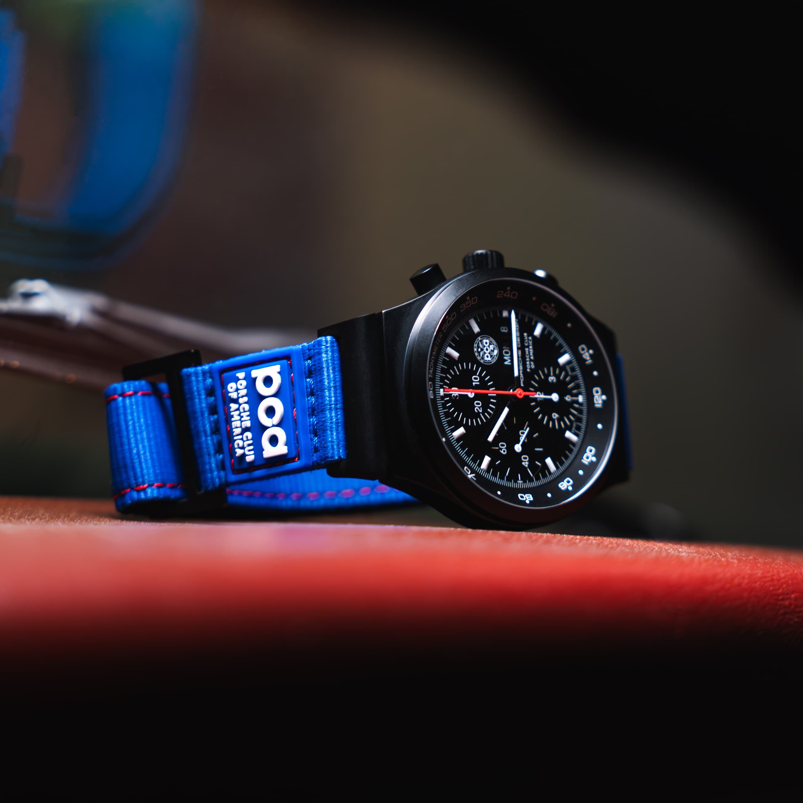 En plus du bracelet en titane classique, la montre est livrée avec un bracelet textile Club Blau arborant le logo du PCA. Et ceux qui achèteront cette montre d’exception avant le 30 septembre 2025 recevront un cadeau anniversaire spécial : le bracelet « 70e anniversaire », conçu dans les couleurs rouge, blanc et bleu du PCA, et orné du logo commémoratif « 70 Years Porsche Club of America ».