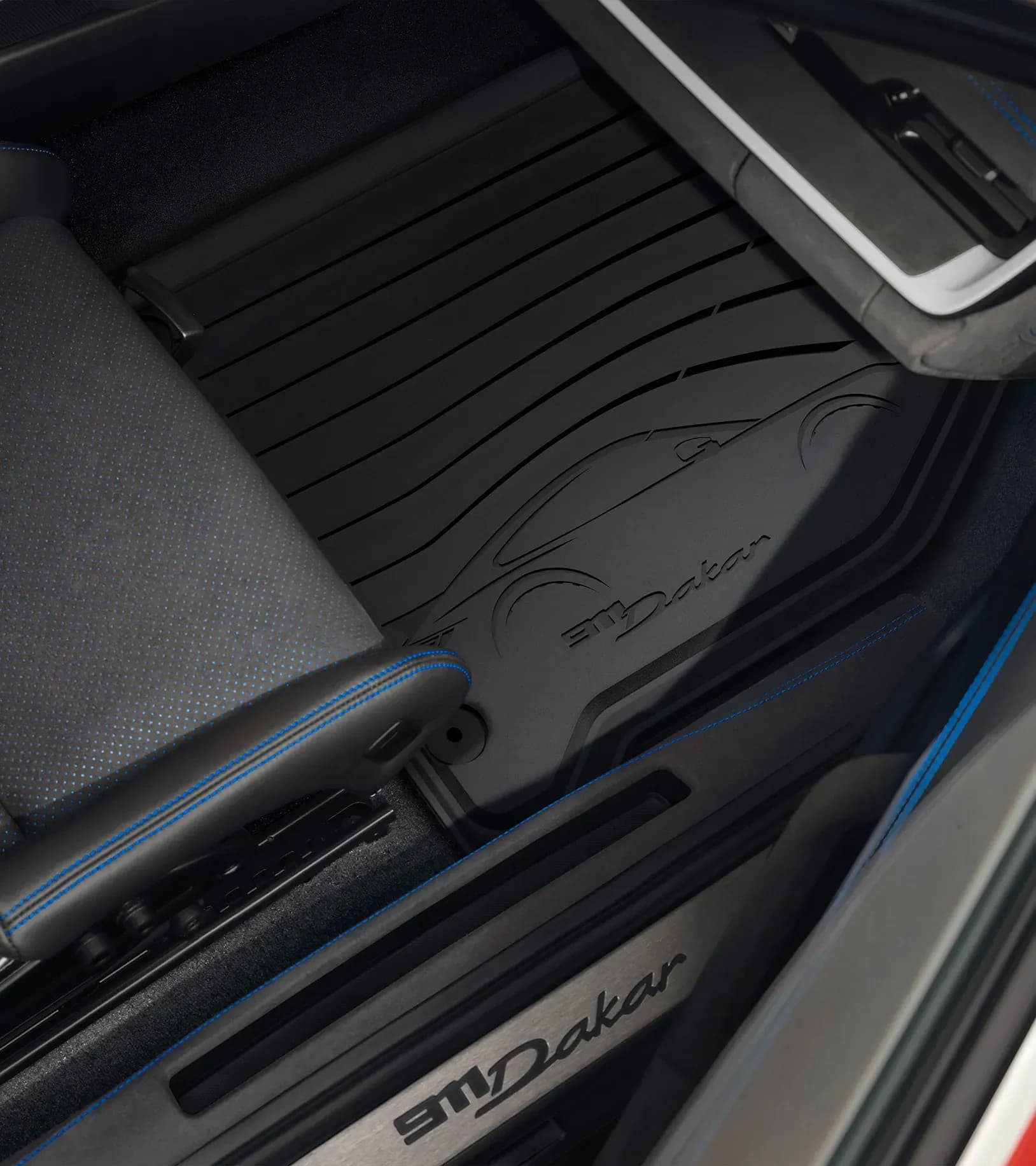 Ein Set besteht aus 2 schwarzen Gummi-Fußmatten für die Fahrer- und die Beifahrerseite. Jede Matte zeigt die Fahrzeugsilhouette des 911 Dakar und vertiefte Strömungslinien mit angeschrägtem Schattenwurf. Zusätzlich sind die Start- und Zielkoordinaten der Rallye Paris–Dakar 1984 angegeben: auf der Fußmatte des Fahrers die Koordinaten der Place de la Concorde in Paris (48° 51' 56,279" N, 2° 19' 16,45" E), auf der Fußmatte des Beifahrers die Koordinaten des Retba-Sees vor den Toren Dakars (14° 50' 19,622" N, 17° 14' 2,875" W).