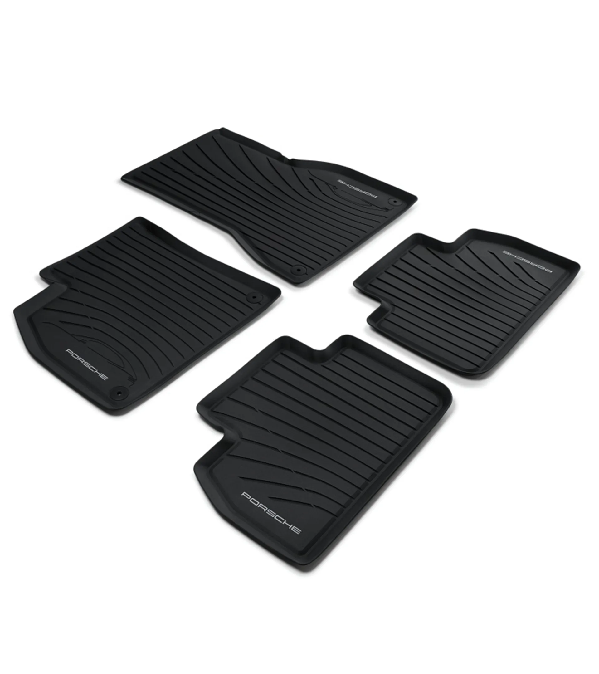 Vierteiliger Satz schwarzer Allwetterfußmatten in ansprechendem Design mit Fahrzeugsilhouette und „PORSCHE“ Schriftzug. Verrutschsicher und wasserundurchlässig mit hochgezogenem, umlaufendem Rand.