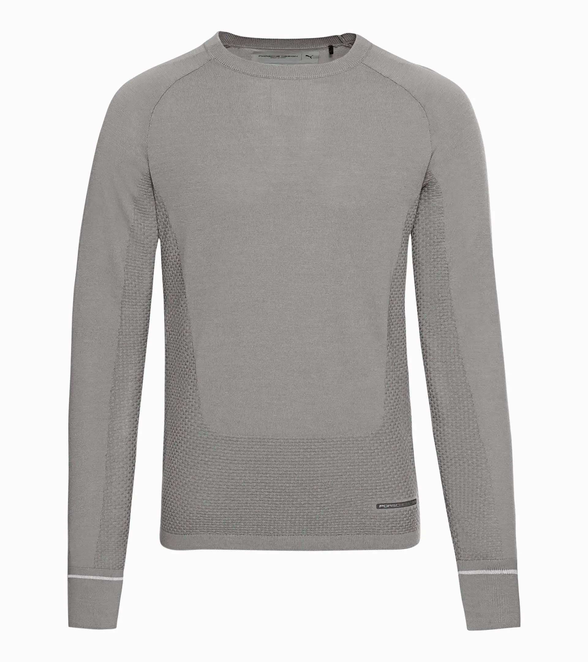 Das technische Upgrade des klassischen Pullovers: Der Porsche Design evoKNIT® Crew Neck aus High-Performance-Strick hebt den Herrenmode-Evergreen Rundhalspullover auf ein neues Level. Die neue evoKNIT®-Technologie mit wasserabweisender Ausrüstung bringt wärmende Merinowolle und atmungsaktive, feuchtigkeitsregulierende Belüftungszonen in Mesh-Struktur fast nahtlos zusammen. So bietet der Pullover neben maximaler Bewegungsfreiheit und einer einzigartigen Designästhetik auch ein warmes, angenehm trockenes Tragegefühl für kalte Tage. In den Ärmelbündchen eingestrickte Streifen aus reflektierendem Garn verleihen ihm, zusammen mit der nahtlosen Konstruktion und der dynamischen Linienführung, einen ganz eigenen, exklusiv-sportlichen Charakter. Wenn Pullover, dann so.