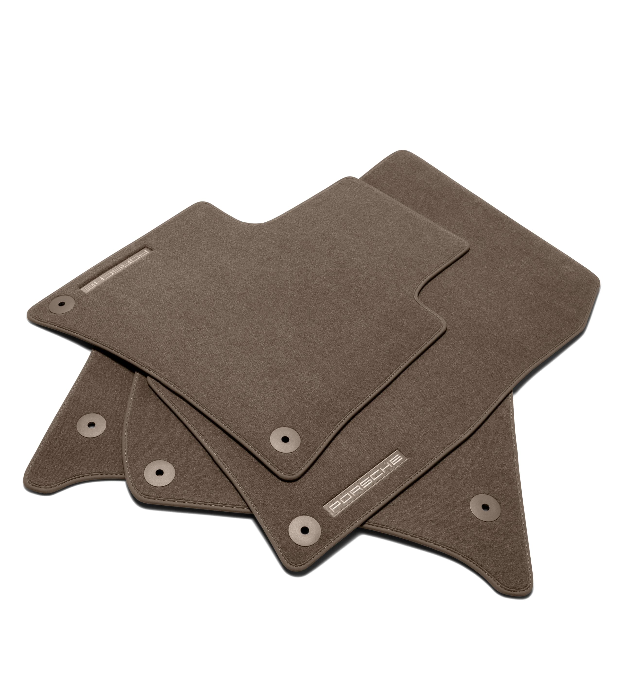 Vierteiliger Satz, in ausgewählten Interieurfarben, mit Nubukeinfassung und Einleger mit eingesticktem, silbernen „PORSCHE“ Schriftzug.
