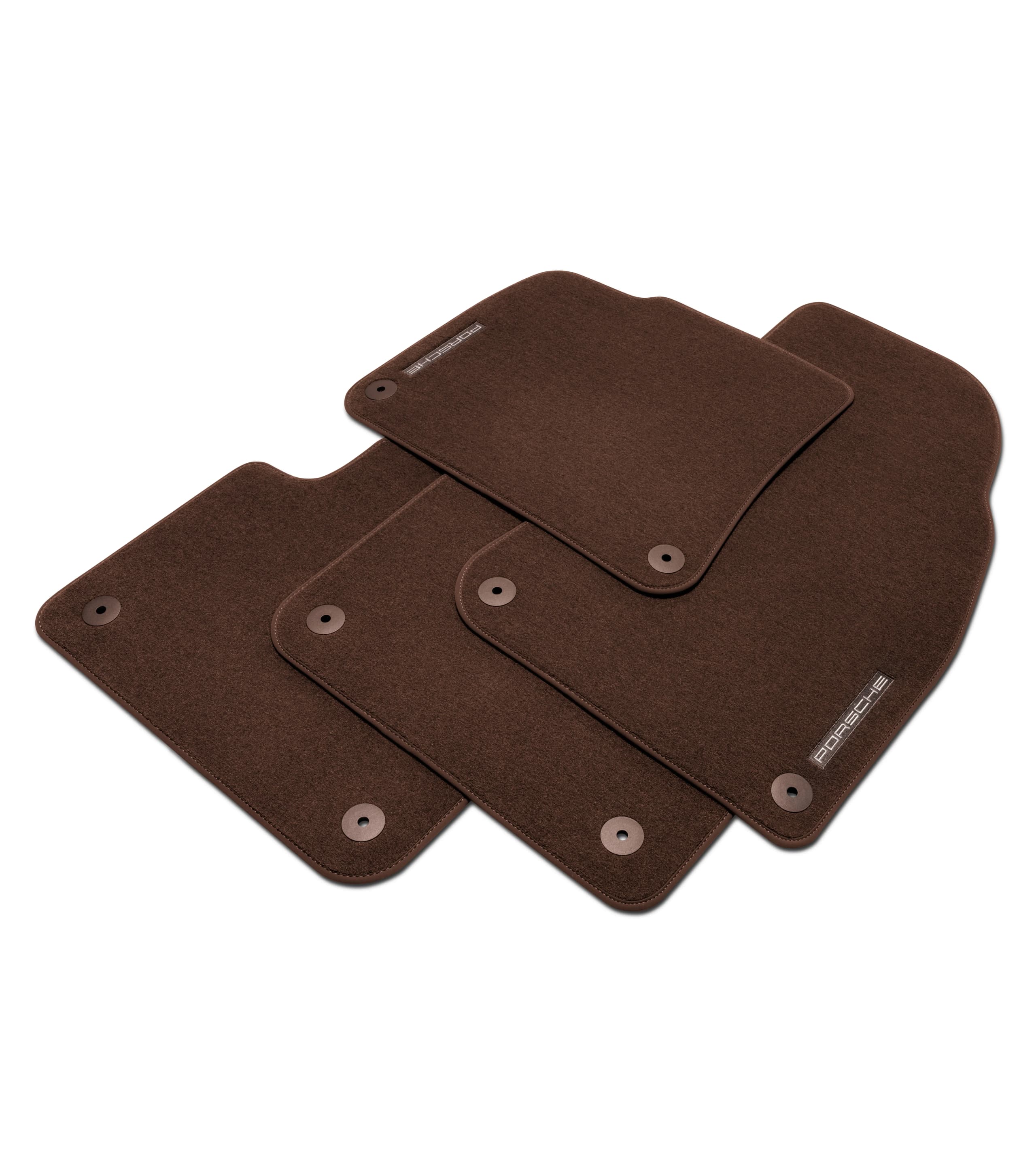 Vierteiliger Satz, in ausgewählten Interieurfarben, mit Nubukeinfassung und Einleger mit eingesticktem, silbernen „PORSCHE“ Schriftzug.