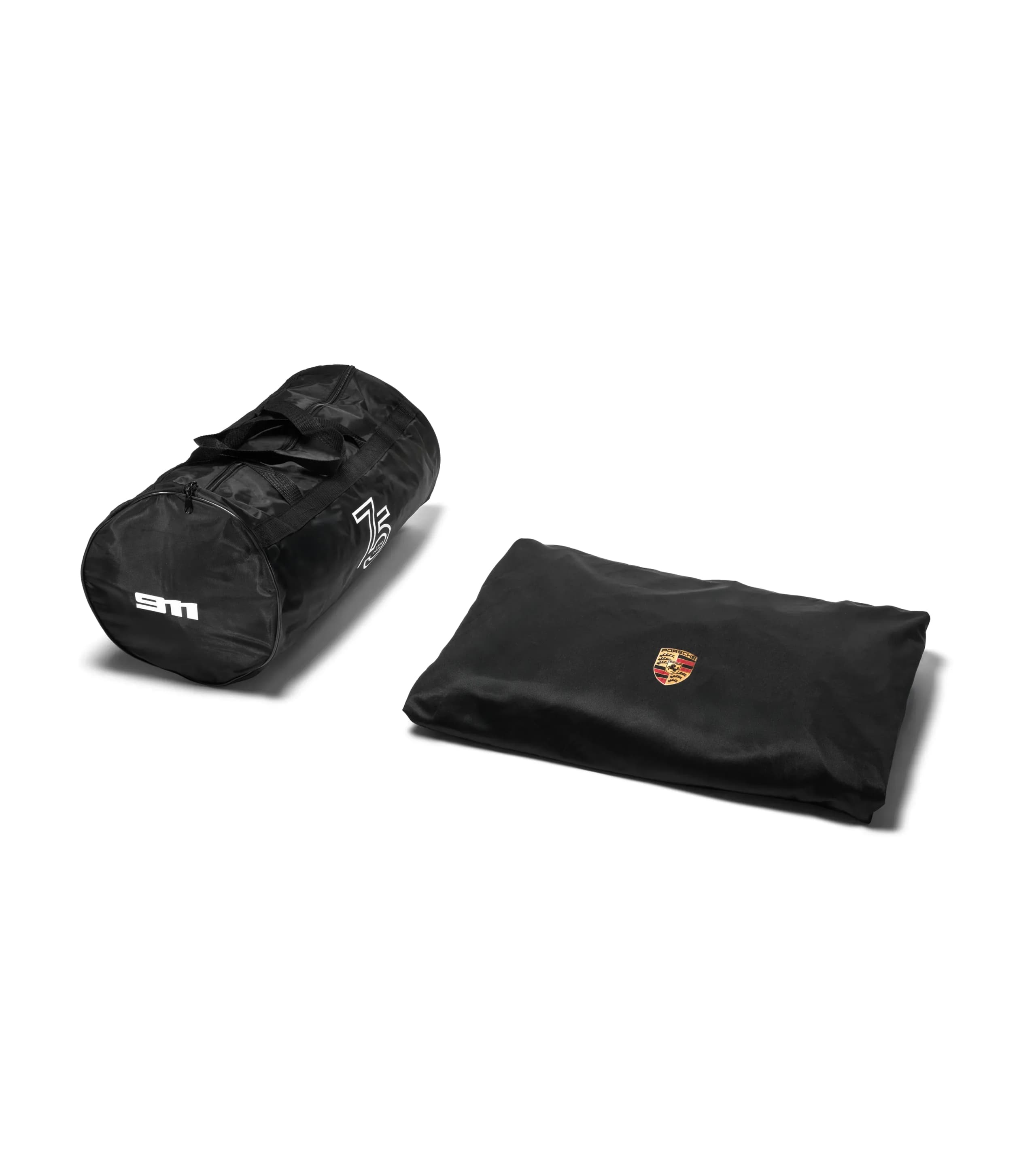 Passgenaue schwarze Indoor-Fahrzeugabdeckung aus atmungsaktivem, antistatischem und schmutzabweisendem Material. In „70 Jahre Porsche“ Design mit Keder, seitlichem „Speedster“ Schriftzug und „70 Jahre Porsche“ Logo silberfarben.