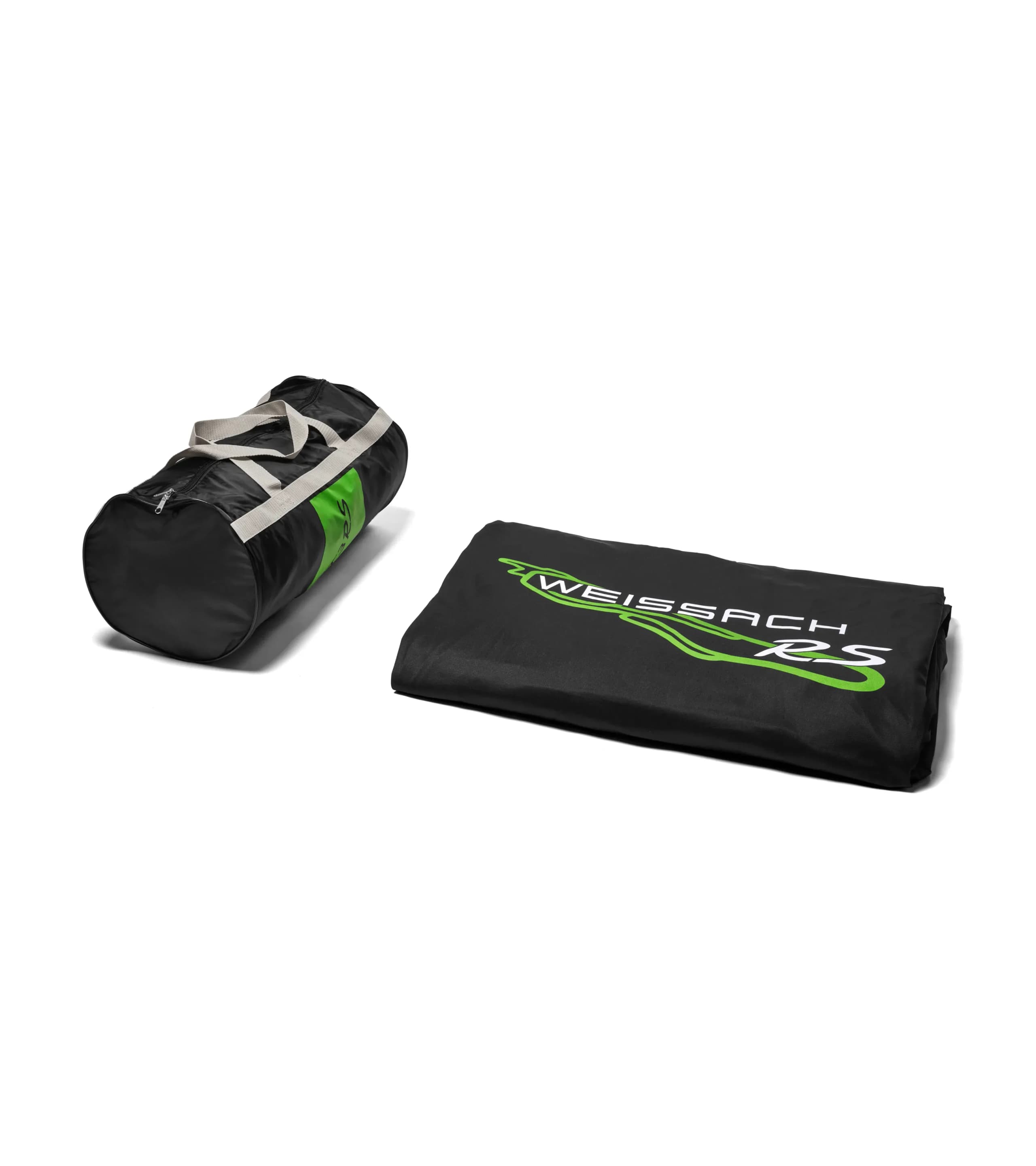 Passgenaue schwarze Indoor-Fahrzeugabdeckung aus atmungsaktivem, antistatischem und schmutzabweisendem Material. In 911 GT3 RS Design mit Keder in Lizardgrün, Logo „Weissach-Paket“ in Weiß-Lizardgrün auf der Fronthaube, seitlichem Modellschriftzug sowie „PORSCHE“ Schriftzug auf dem Heckflügel in Weiß.