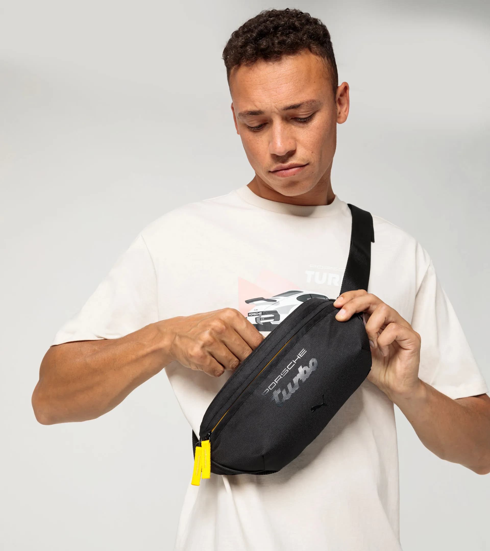 Perfekt für den Alltag: die stylische Bauchtasche. Hergestellt aus mindestens 30 % recyceltem Material ist sie ideal für den nachhaltigen Porsche-Fan. Der 3D-Porsche Turbo-Print und das Puma Logo runden das stilvolle Design ab.