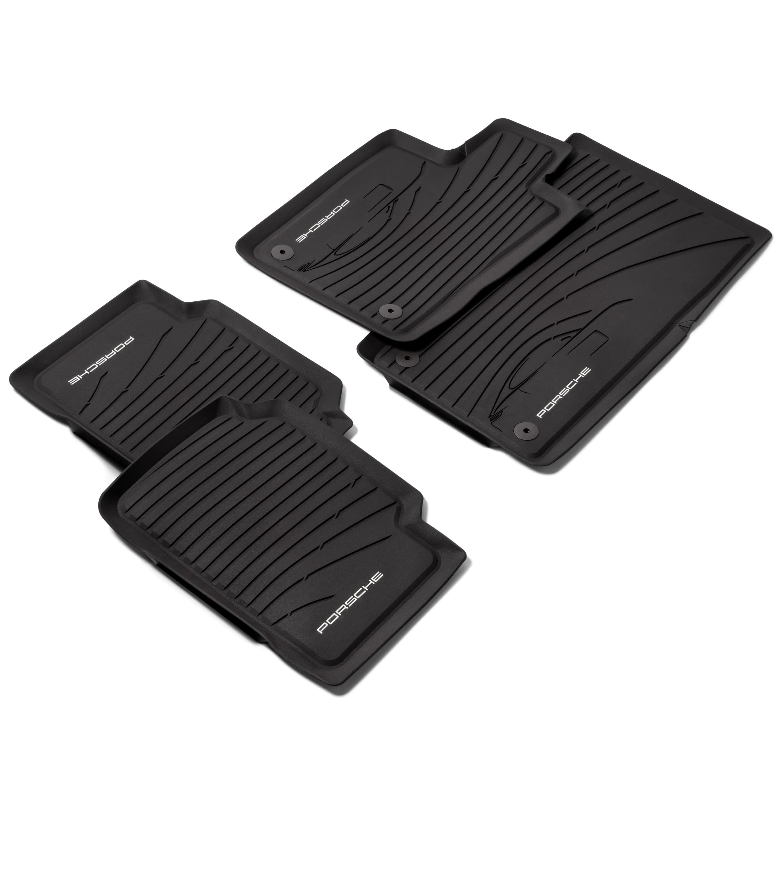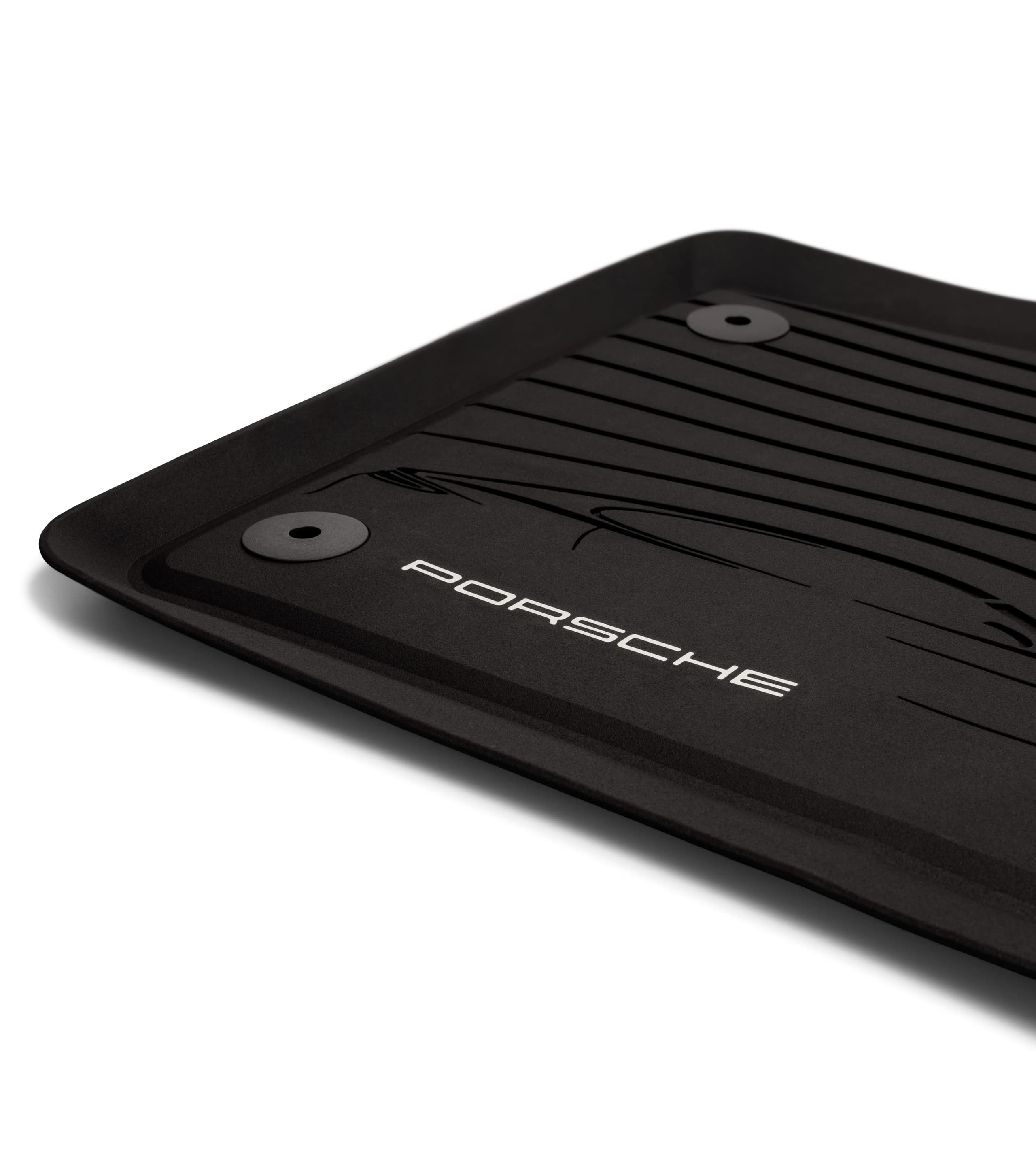 Four-piece set in an attractive design with vehicle silhouette and 'PORSCHE' lettering. Non-slip and waterproof with raised surrounding edge.