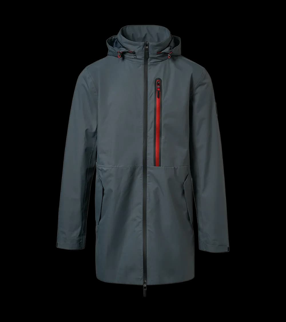 Parka à capuche escamotable et deux poches latérales avec boutons à pression et fermeture à glissière. Le design fonctionnel comprend une poche poitrine à glissière et une seconde poche poitrine dissimulée avec glissière à couture fine et un accès interne à fermeture à glissière.