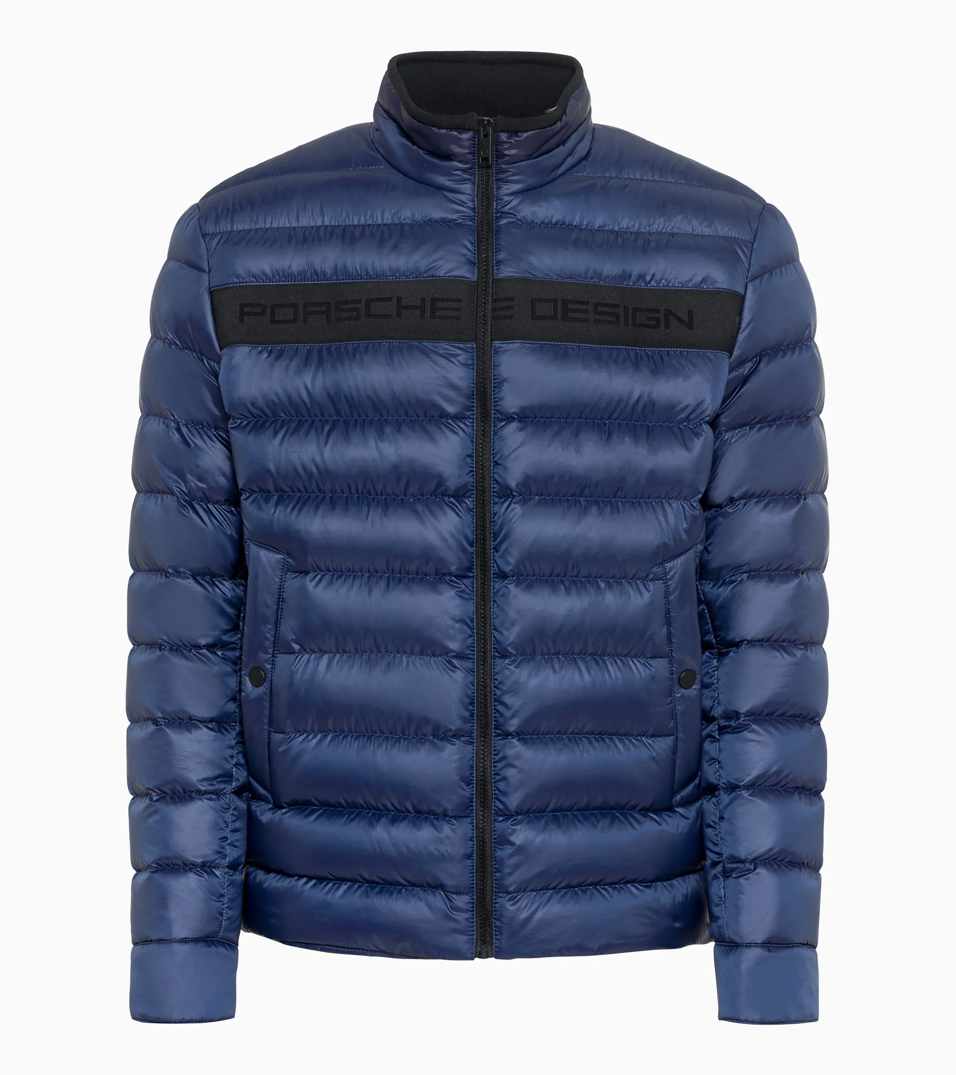 Leggera come una piuma – ma senza piume: la giacca dal taglio dritto con imbottitura senza piumino è perfetta per le mezze stagioni. Le due tasche sui fianchi si chiudono con bottoni a pressione, mentre le tasche interne con cerniere. Dettagli raffinati tipici di Porsche sono il tessuto a maglia all'interno del colletto rialzato e la fettuccia Porsche Design sulla parte anteriore della giacca.