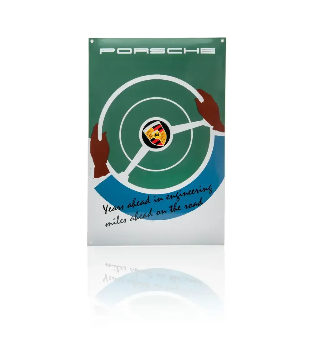 Ispirato allo stile minimalista del Bauhaus, lo slogan "Years ahead in engineering, miles ahead on the road" (Anni avanti nella progettazione, miglia avanti sulla strada) sottolineava perfettamente il design superiore e le prestazioni di guida impressionanti della Porsche 356. Questa originale pubblicità degli anni Cinquanta, destinata all'importante mercato statunitense, stilizzava il volante della 356, ornato al centro dal grande stemma Porsche.
