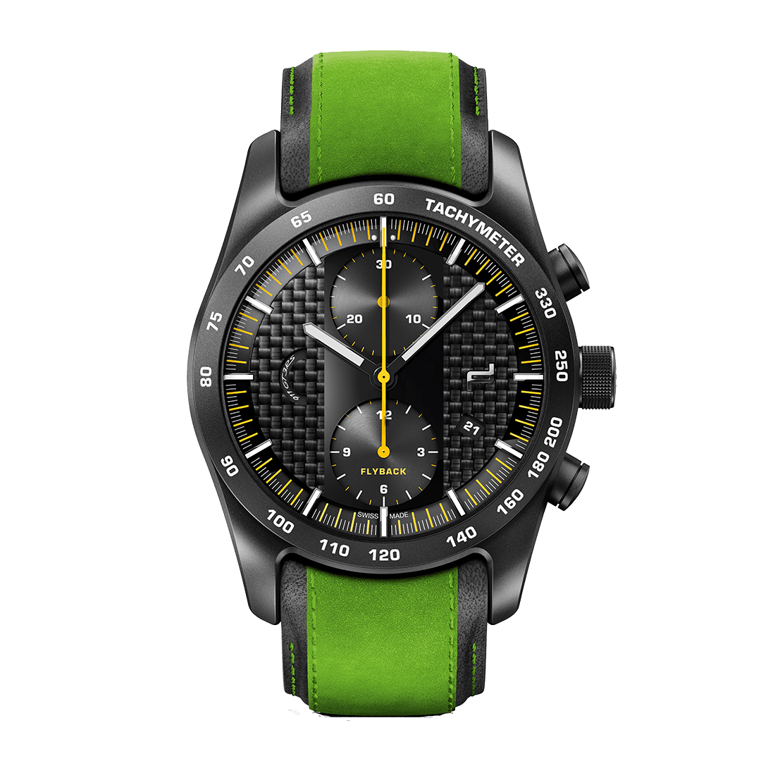 Anche in termini di equipaggiamento, il cronografo Porsche Design 911 GT3 RS è interamente basato sul concetto di veicolo. I cinturini sono realizzati in vera pelle per veicoli Porsche, proprio come gli interni del veicolo. Il cronografo è dotato di due cinturini in pelle ciascuno con Alcantara® verde lucertola e nero.