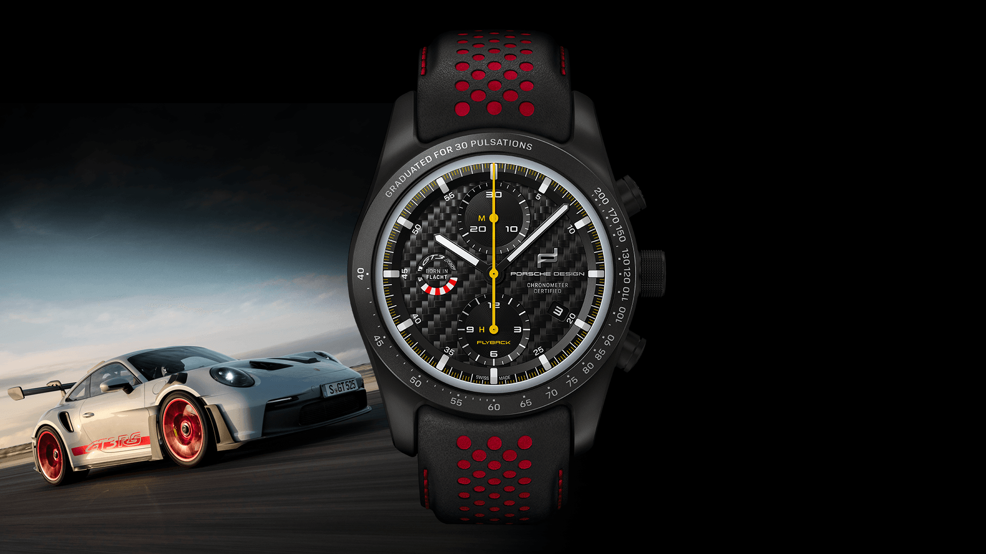 L'esclusivo disco dei secondi a ore 9, in nero opaco con la scritta bianca del modello "911 GT3 RS" e il design Curbs rosso e bianco, entusiasma in pochi centesimi di secondo. La scritta "BORN IN FLACHT" al centro del disco dei secondi sottolinea anche il carattere performante di questo segnatempo unico, prodotto nella manifattura Porsche di Soletta, in Svizzera. Quando si taglia il traguardo, i secondi del cronografo e il contatore dei 30 minuti mostrano con precisione se si è riusciti a battere il proprio miglior tempo. E grazie alla finestra della data a ore 4, sarà possibile memorizzare il proprio obiettivo motoristico raggiunto.