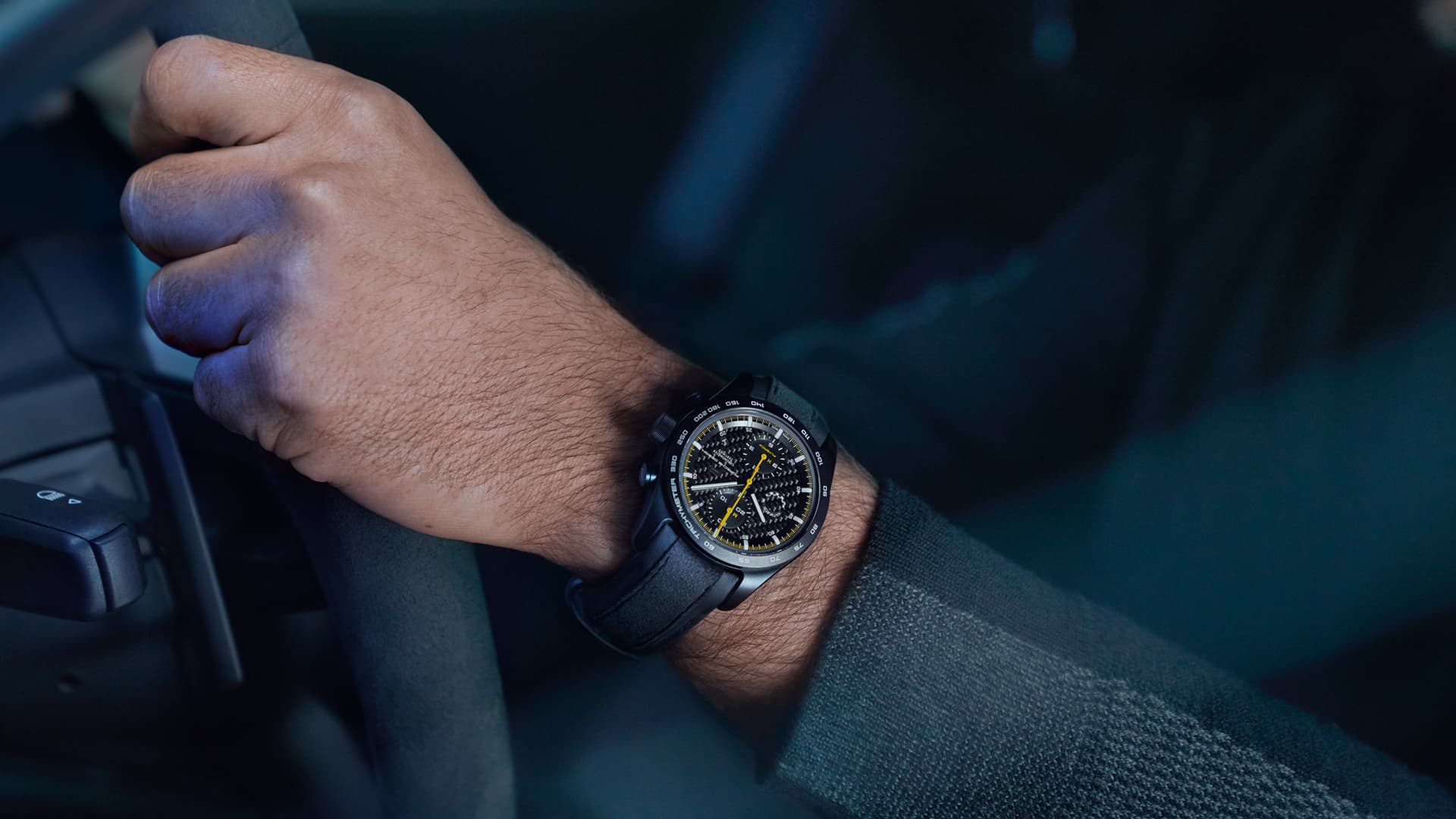 Nella 718 Cayman GT4 RS sono stati utilizzati componenti che, oltre a essere estremamente resistenti, sono anche leggeri. Lo stesso concetto di costruzione leggera con carattere performante si ritrova nel cronografo 718 Cayman GT4 RS con cassa in titanio. Il quadrante nero opaco, le lancette gialle dei secondi del cronografo e il contatore del cronografo sono ispirati al contagiri della vettura sportiva GT. L’anello colorato è mantenuto nella tonalità grigio artico. Il cinturino, che porta stampato “GT4 RS”, è realizzato con la pelle originale degli interni Porsche e combinato con lo sportivo Race-Tex.