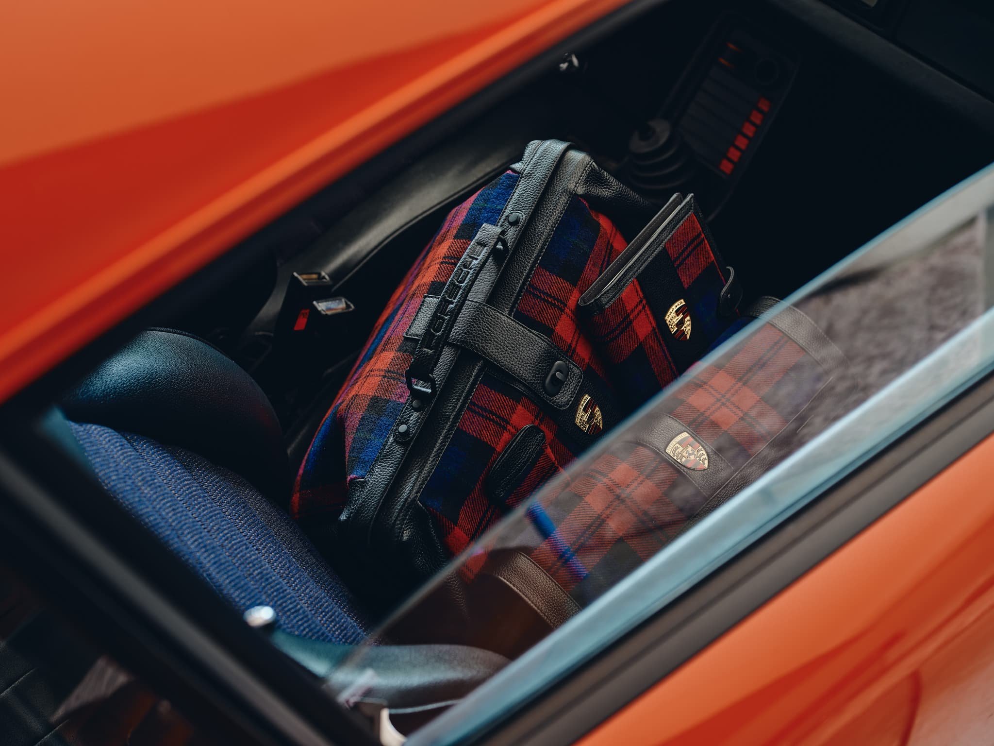 La Touring Bag 911 in edizione limitata si ispira al famoso motivo tartan dei sedili e dei materiali degli interni della 911 Turbo, regalata a Ferry Porsche in occasione del suo 67° compleanno.
