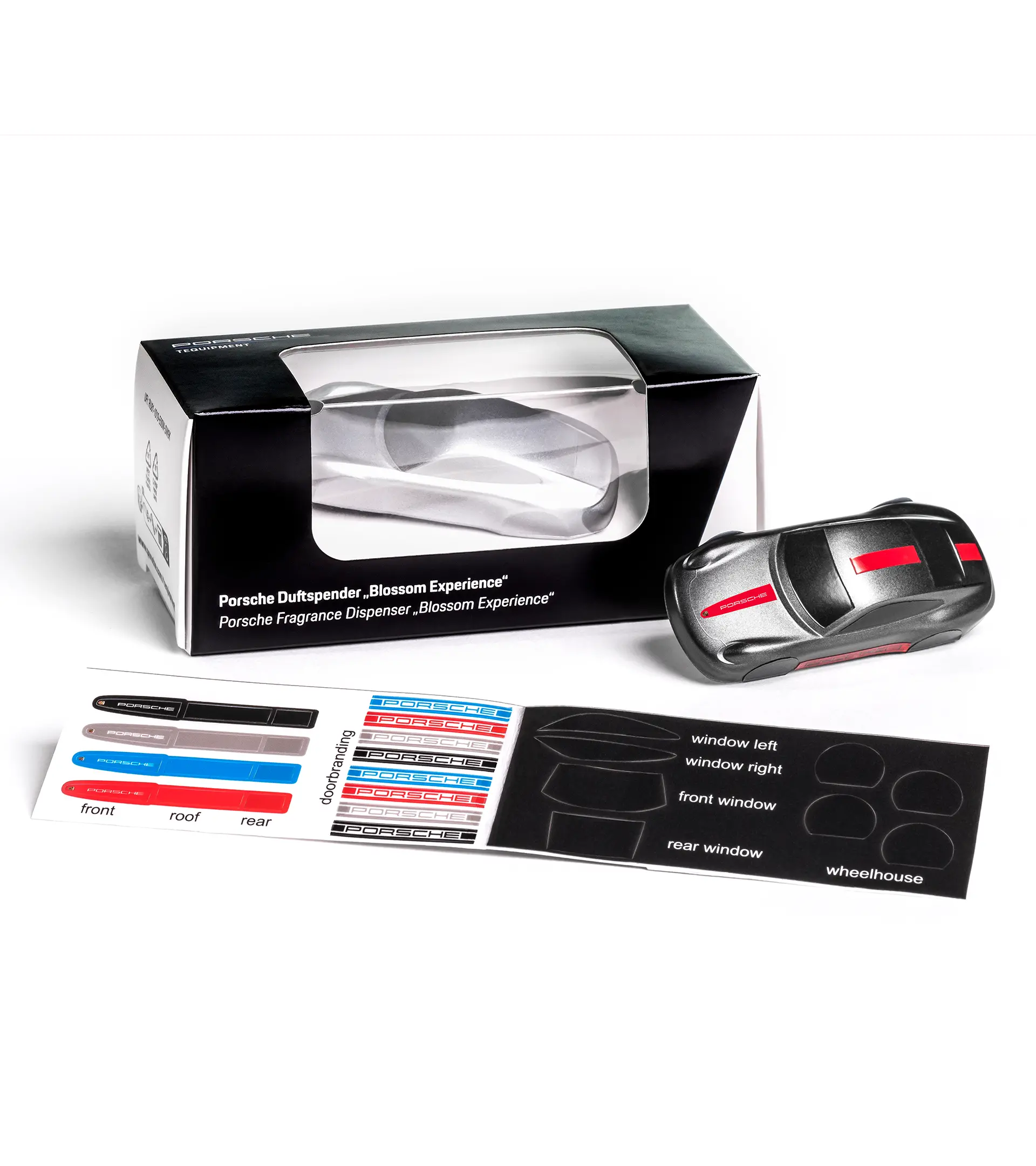 The exclusive Porsche car fragrances make the journey in your Porsche even more unique and ensure a pleasant olfactory experience inside the vehicle. The fragrance diffuser, specially developed for Porsche in the original 911 design, is available in different fragrances and colour variants. The perfect addition: the included sticker set enhances the vehicle silhouette with decorative strips with "PORSCHE" lettering on both the centre and the side and completes the 911 design with decorative stickers for the wheels and windows. The fragrance dispenser is attached directly to the air grille so that your car's ventilation distributes the pleasant fragrance throughout the vehicle.