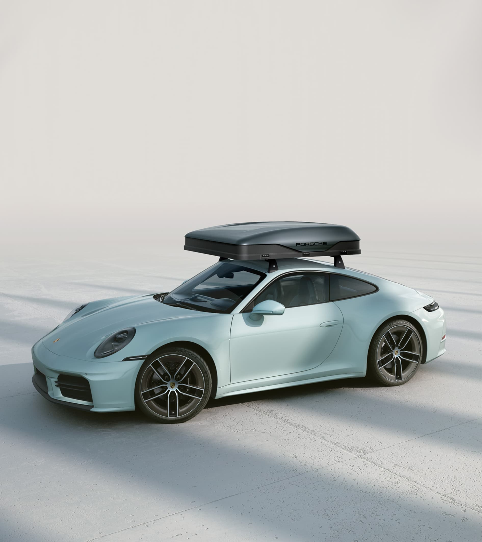 The hard shell case, designed in the Weissach development centre, is available in a choice of black/light grey or black/dark grey. It was designed by Studio F.A. Porsche in Zell am See and features the distinctive matt black "PORSCHE" lettering on both sides. This all season tent features a breathable cotton blend fabric, waterproof zippers and an additional rain cover for the access hatch. The side walls are a special eye-catching feature. They quote the legendary flyline of the 911 and are also printed with "PORSCHE" lettering. Yet the interior also has some highlights to offer, for example the well insulated, light grey quilted lining, which is printed with a mountain silhouette at the head end. The quilted pattern resonates on the integrated, comfortable high-density polyfoam mattress.