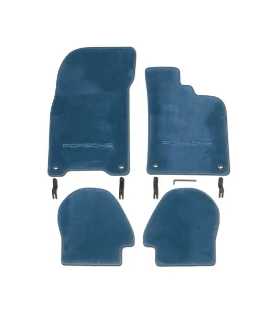 Set of four floor mats in Provence Blue for right-hand-drive vehicles, including fastening materials; suitable for Porsche 993 from years of construction 1994 to 1998 with Tiptronic gearbox.