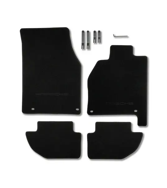 Set of four floor mats in Black for right-hand drive vehicles including fastening materials; suitable for Porsche 944 from model years 1982 to 1991 and Porsche 968 from model years 1992 to 1995.
