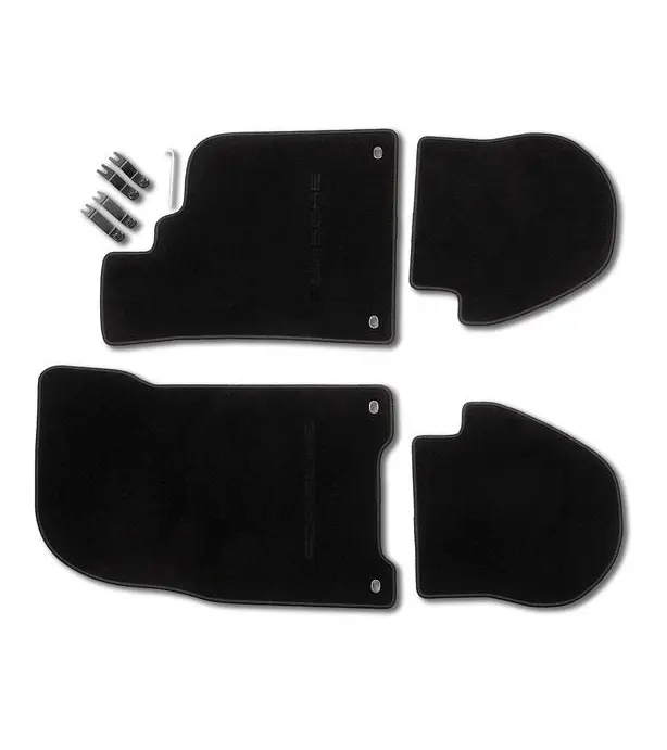 Set of four floor mats in Black for Tiptronic right-hand-drive vehicles, including fastening materials; suitable for Porsche 964 from years of construction 1989 and 1990 and for Porsche 993 from years of construction 1994 to 1998.