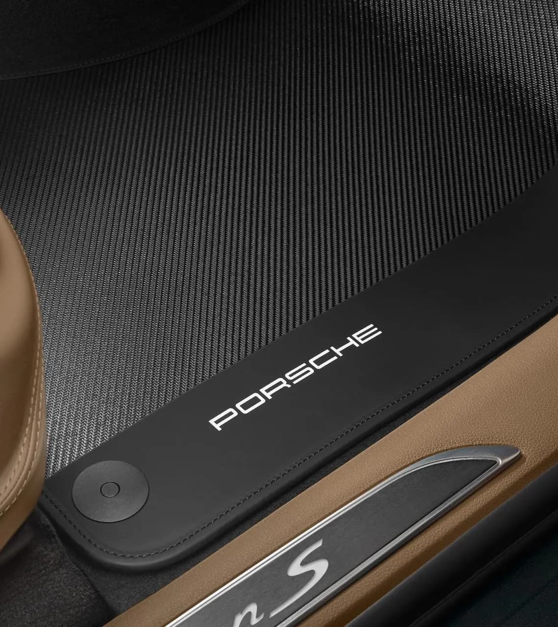 Four-piece set in real carbon with leather surround and stitching in Black. Includes leather inlay in Black with 'PORSCHE' lettering.
