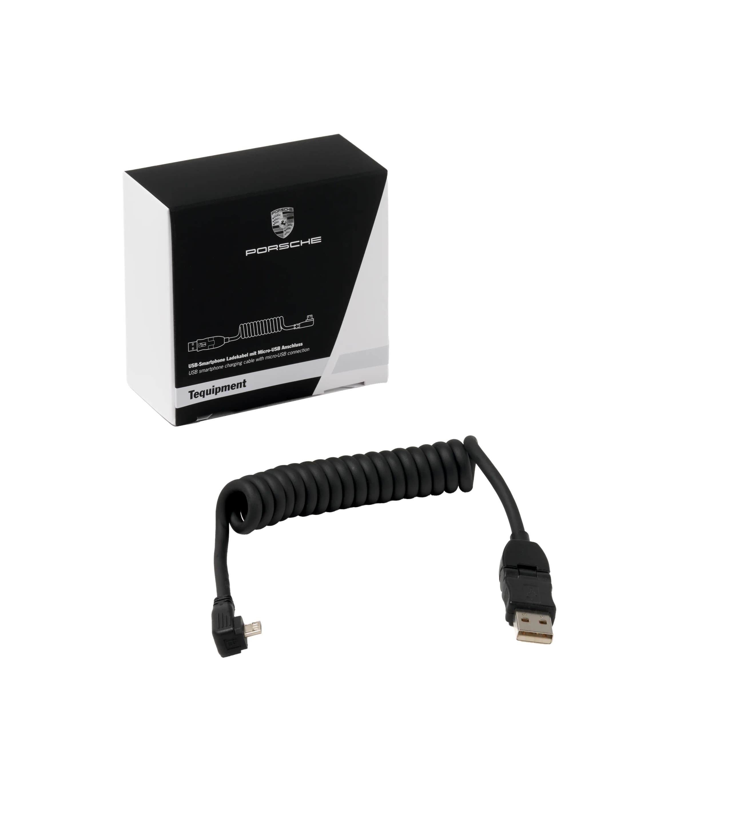 Spiral cable with movable USB connector and angled Smartphone connection.