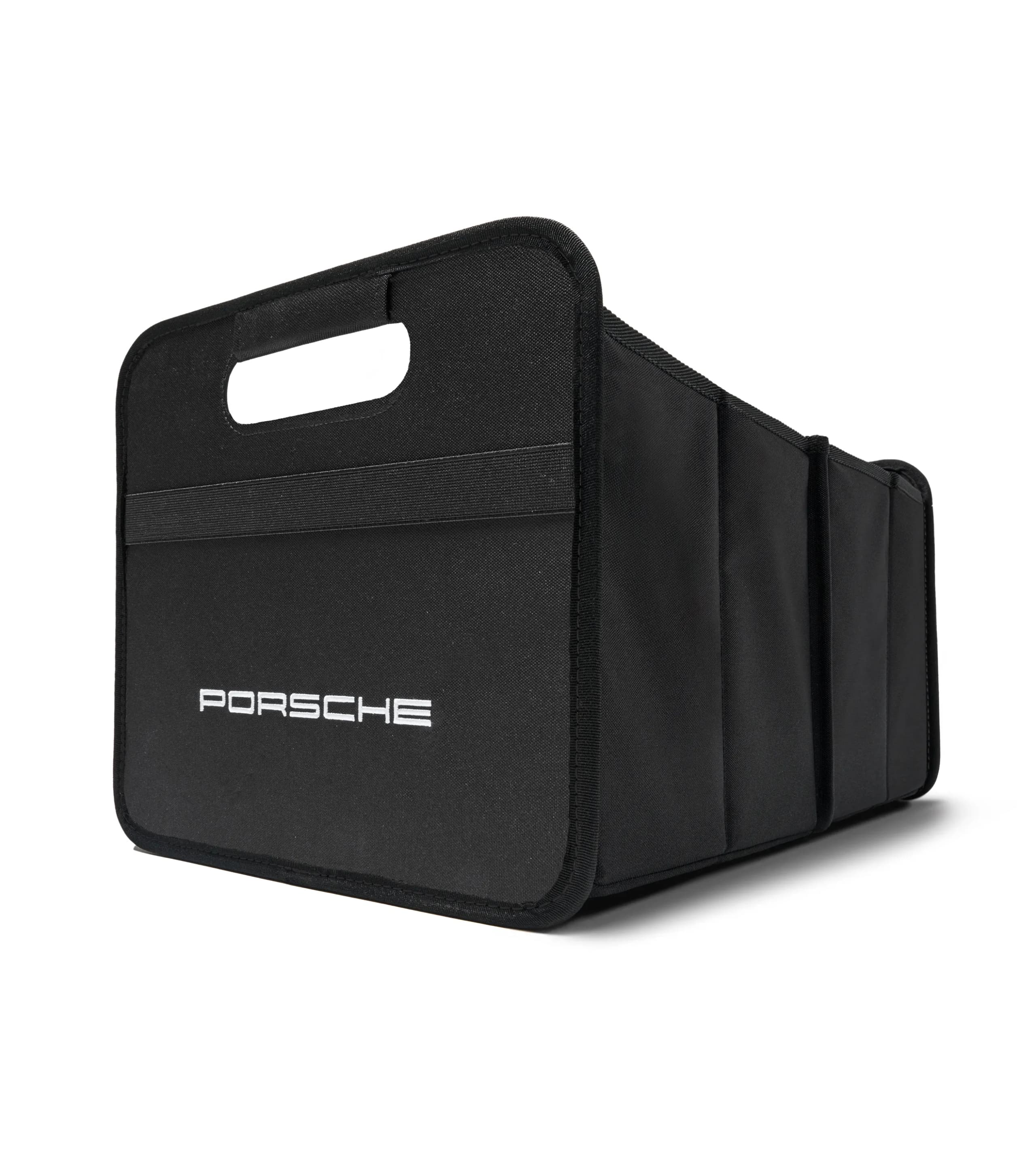 Když se nepoužívá, lze jej upevnit pomocí gumového popruhu a uložit do zavazadlového prostoru. V rozloženém stavu, s objemem 30 l a nosností až 30 kg, máte v zavazadlovém prostoru vždy po ruce vše, co potřebujete na cestu. Po rozložení vzniknou 2 oddělené úložné prostory, každý s boční síťkou pro pohodlné uložení velkých i malých předmětů. Díky praktickým madlům na obou stranách lze box do zavazadlového prostoru snadno vyjmout a zasunout tam, kde je potřeba, i když je plně zabalen. Lze jej také složit tak, abyste mohli používat pouze jednu stranu. To znamená, že jej lze umístit nejen do zavazadlového prostoru, ale také do interiéru vozidla, do kanceláře a všude tam, kde ho potřebujete. Box se vyznačuje nejen svou vysokou odolností. Díky kvalitnímu zpracování, propracovanému designu a vyšitému logu Porsche nabízí funkční řešení pro stylový pořádek. Praktické jsou také další vložky, které jsou k dispozici pro skládací box do zavazadlového prostoru a rozšiřují možnosti využití tašky: Vložka na láhev, Vložka do chladicí tašky