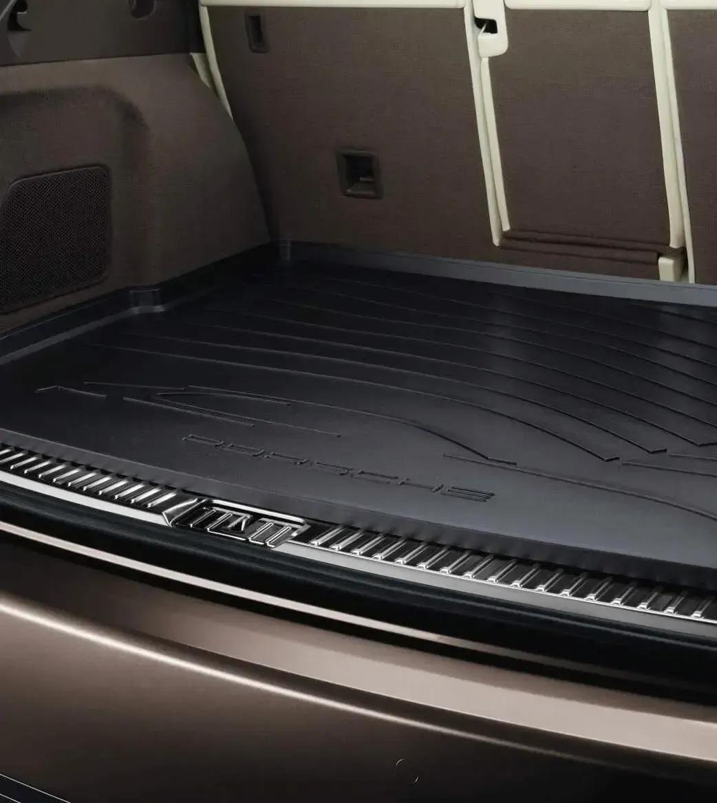 Tvarovaná ochranná vana s nápisem „PORSCHE“ a siluetou vozidla. Voděodolná a omyvatelná úprava.